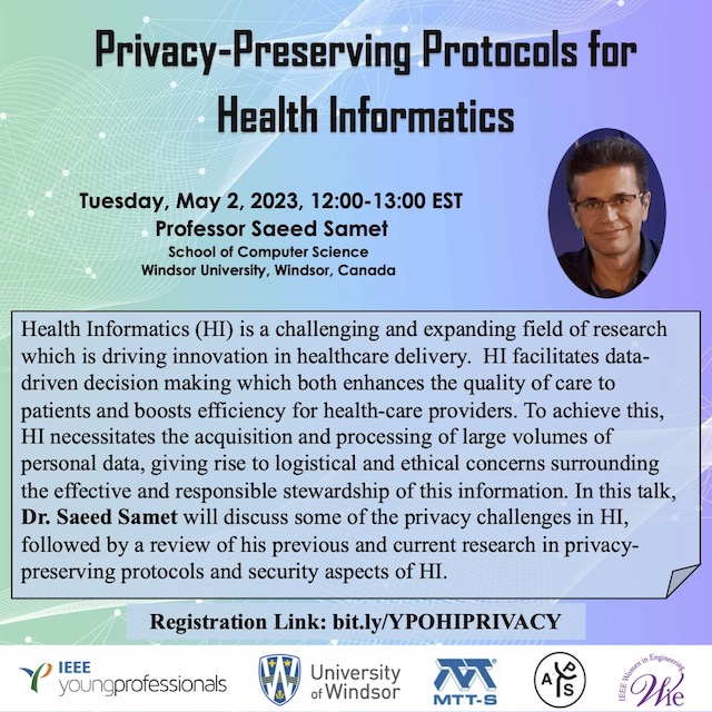 Health Informatics (HI) is a challenging and expanding field of research which is driving innovation in healthcare delivery. HI facilitates data-driven decision making which both enhances the quality of care to patients and boosts efficiency for health-care providers. To achieve this, HI necessitates the acquisition and processing of large volumes of personal data, giving rise to logistical and ethical concerns surrounding the effective and responsible stewardship of this information. In this talk, Dr. Saeed Samet will discuss some of the privacy challenges in HI, followed by a review of his previous and current research in privacy-preserving protocols and security aspects of HI.