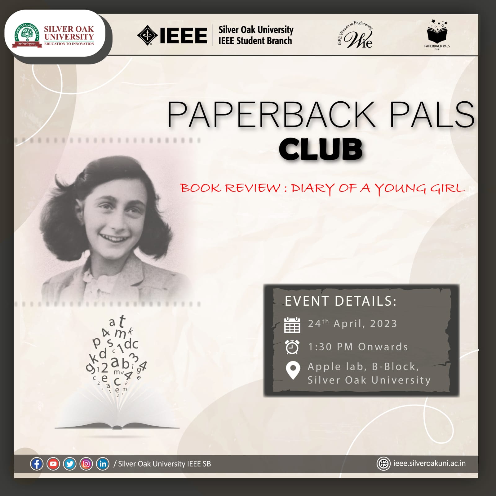 Silver Oak University IEEE Women in Engineering Affinity Group invites you to book review session by *"Paperback Pals"*, a community of book readers that encourages daily reading habits, trying different genres and finding a companion to discuss literature with. We are excited to bring together bibliophiles for a critique of Anne Frank's "The Diary of a Young Girl". Whether you're an avid reader or just starting, join us for this book review and fun activities that will help you take a step towards your reading journey. So what are you waiting for? Let's discover the joy of reading together.