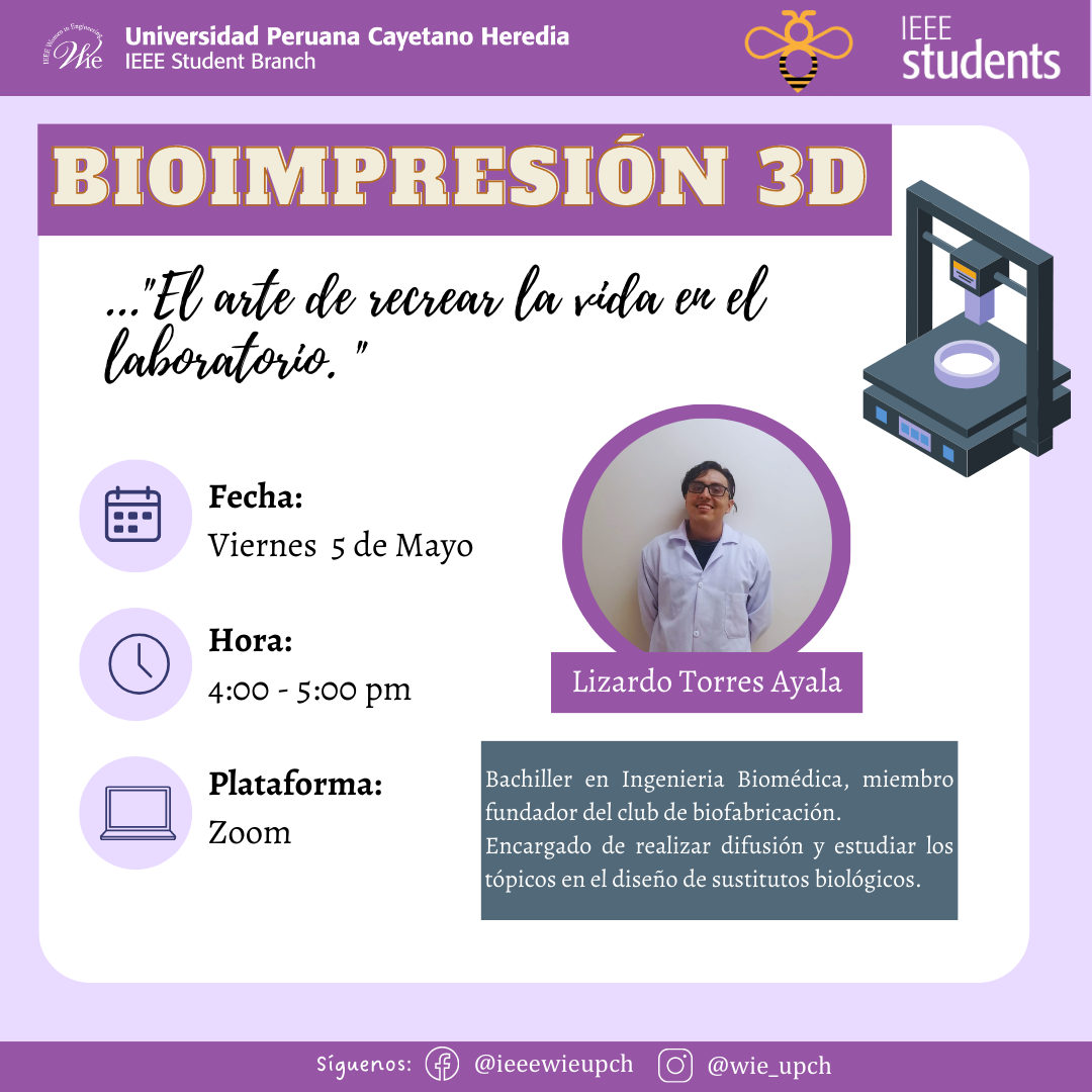 Querida comunidad UPCH 🫂🧡, los invitamos desde WIE UPCH 💜 y con la colaboración del Club de Biofabricación 🐝 a una "Charla de Bioimpresión" 🧬 (modalidad: virtual*👩🏻💻🧑🏻💻👨🏻💻) para el *viernes 5 de Mayo de 4-5pm. Están todos invitados 🫶🏻🙌🏻💜🤍.