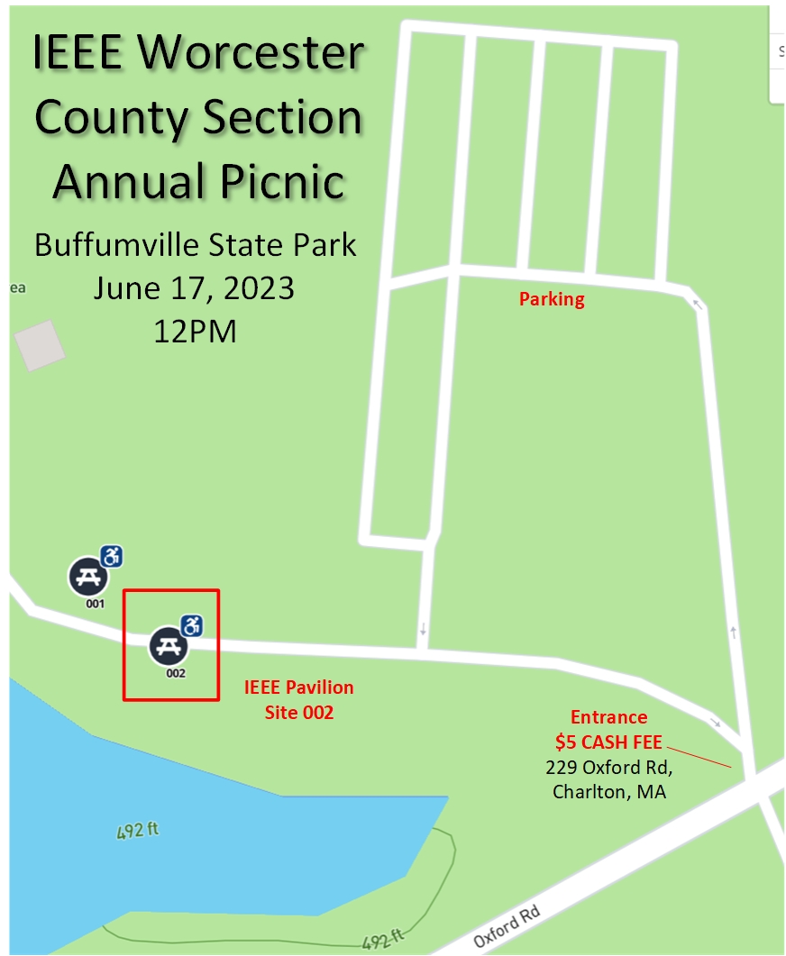 Join the IEEE Worcester County Section at its annual Networking Barbecue and Picnic on Saturday, June 17, 2023 at the Buffumville Lake Park at 229 Oxford Rd, Charlton, MA 01507, at noon. The IEEE Pavilion is located at Site 002. See map for location.