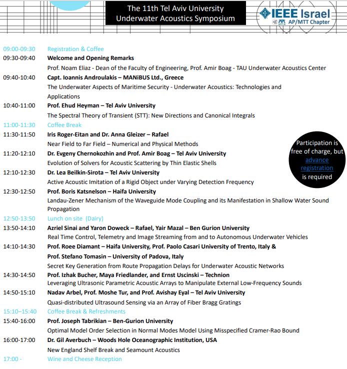 You are cordially invited to attend The 11th IEEE Israel AP/MTT Chapter and Tel Aviv University Underwater Acoustics Symposium, Thursday 15 June, 2023.