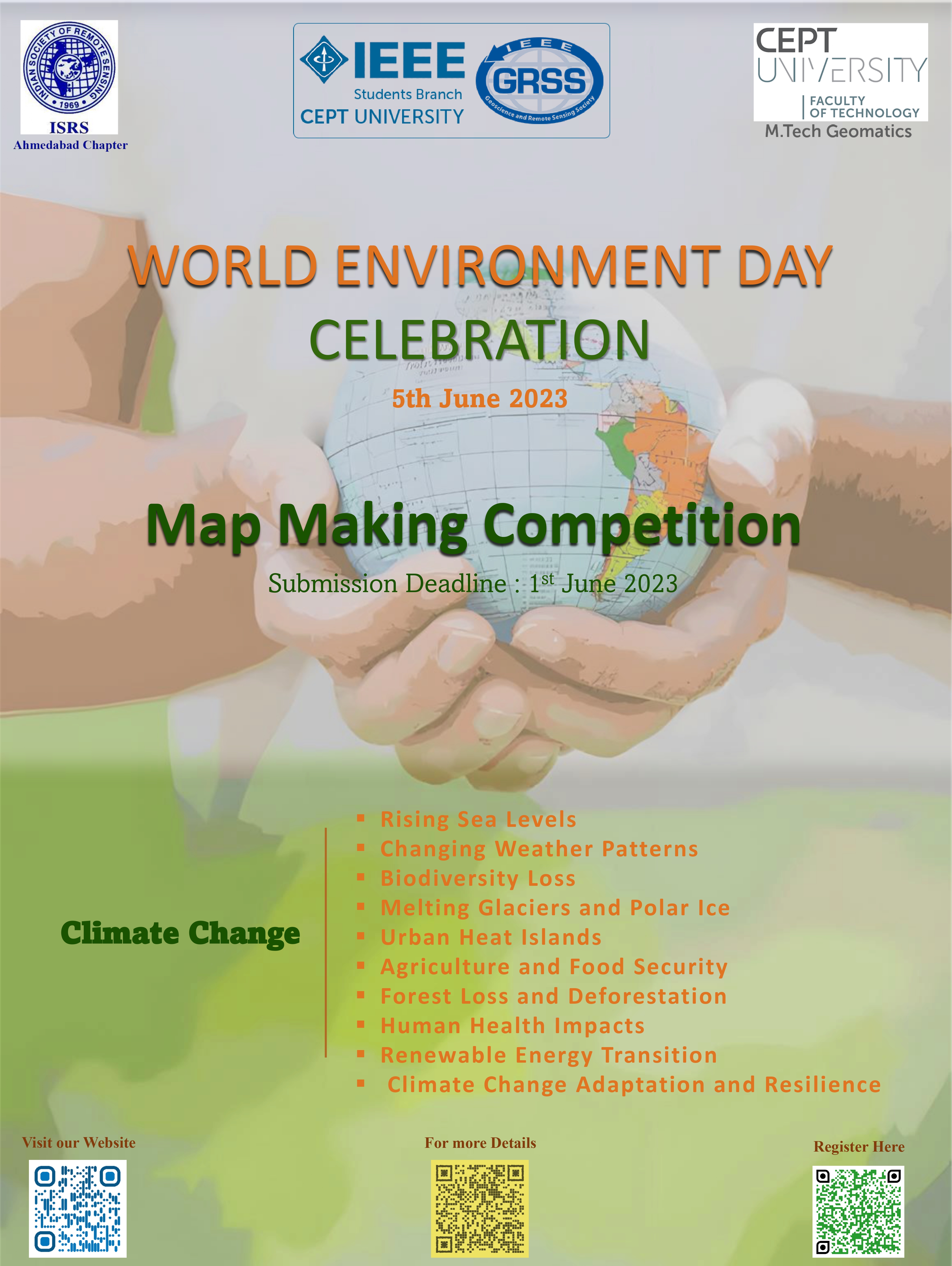 IEEE CEPT University SB and ISRS Ahmedabad chapter jointly come up with "Map Making Competition" on the theme of "Climate Change" for Students and startups as well, which will help you explore your creativity and gives you a platform to showcase the impact of climate change in a visually appealing manner.