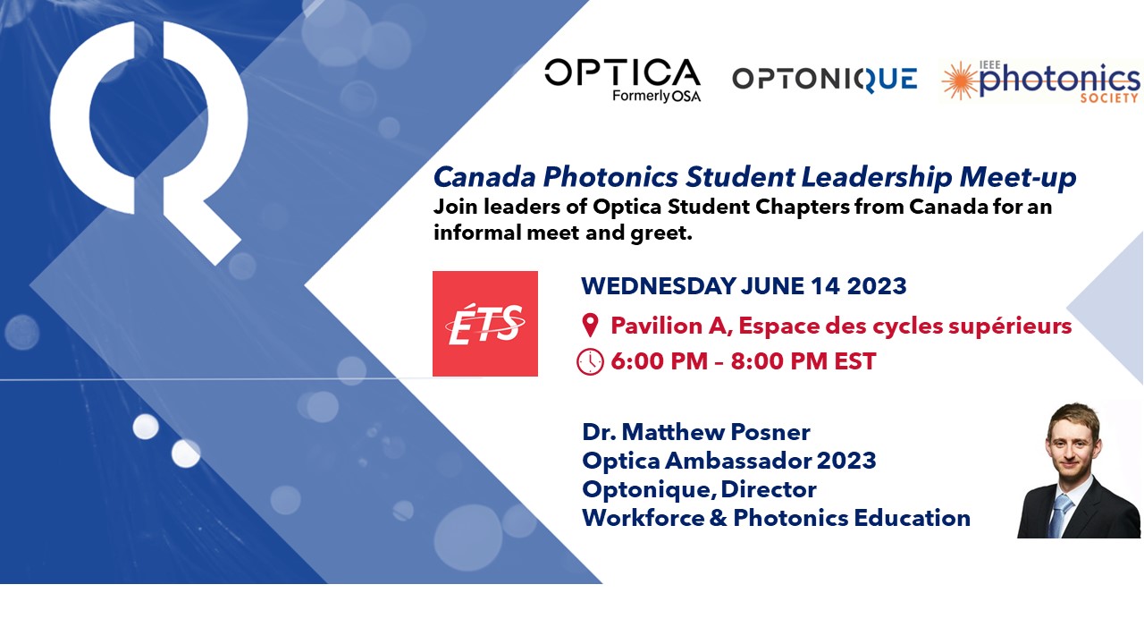 Welcome to Montréal! The ETS Optica Student Chapter, Optonique, the IEEE Photonics Society Chapter, ETS Student Chapter of the IEEE Montreal Section welcome you to meet with the student leadership in Canada.