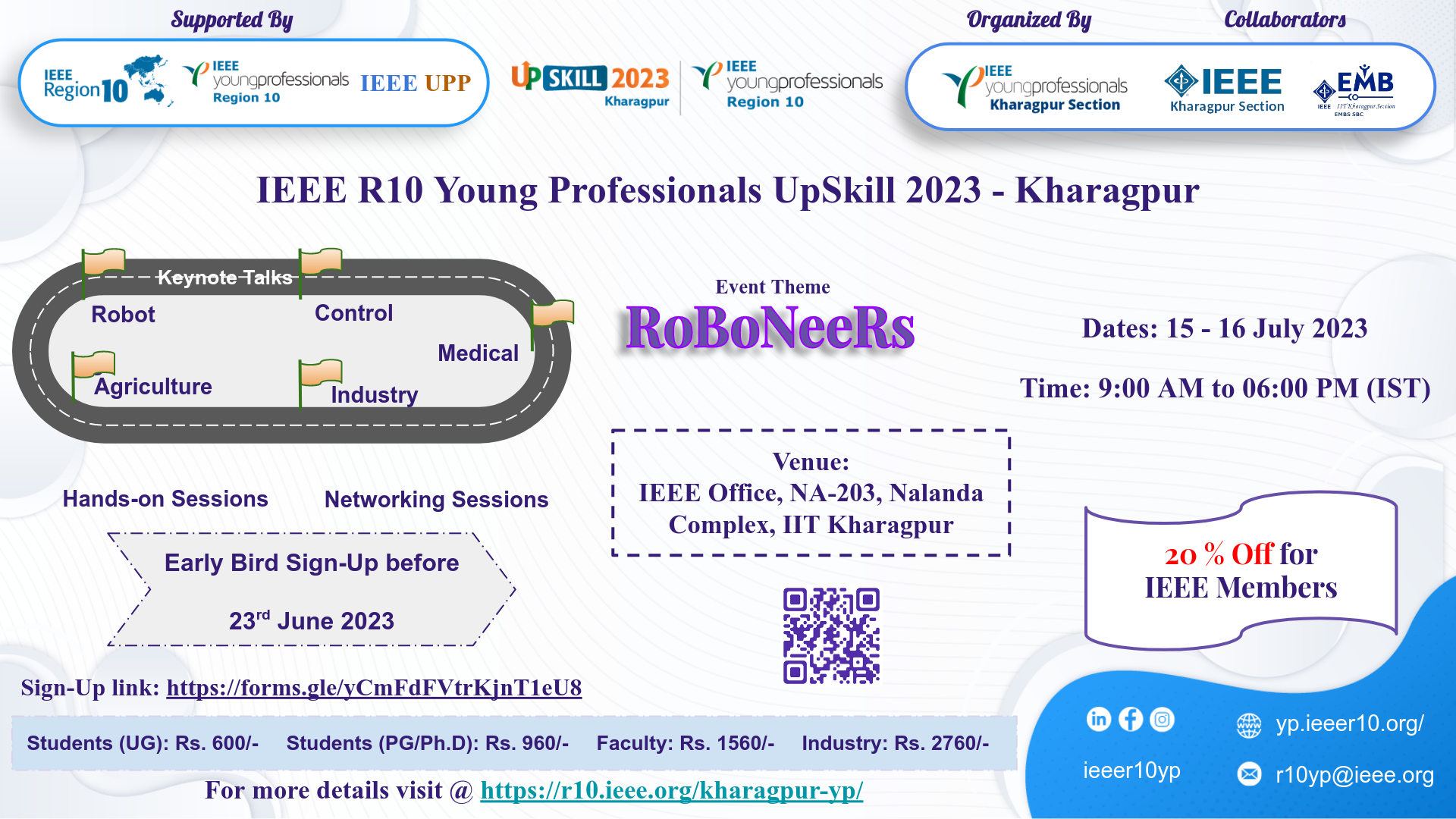 We are pleased to inform that the IEEE Young Professionals Affinity Group Kharagpur Section in collaboration with IEEE Kharagpur Section, and IEEE EMBS SBC IIT Kharagpur is organising an event “IEEE R10 Young Professionals UpSkill 2023 - Kharagpur” on 15-16 July 2023 and this event is supported by IEEE Region 10 Young Professionals and IEEE UPP.