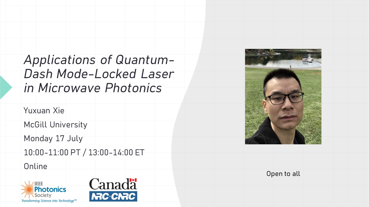 Yuxuan Xie is currently a Ph.D. candidate in Department of Electrical and Computer Engineering at McGill University, where he is supervised by Professor Lawrence R Chen. His research interests are microwave photonics, optical communications systems, silicon photonics, and digital signal processing. His doctoral work focuses on developing different applications for optical frequency comb sources.