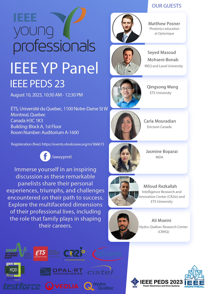 The IEEE Young Professionals Montreal Panel Discussion at the esteemed IEEE PEDS 2023 Conference is your exclusive opportunity to gain valuable insights into the professional journeys of seven accomplished young professionals.