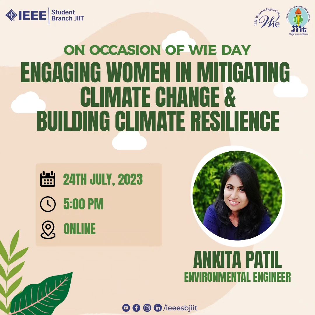 In celebration of WIE Day, IEEE SB JIIT presents a webinar by environmental engineer Ms. Ankita Patil on 'Engaging Women in Mitigating Climate Change & Building Climate Resilience.' It is high time to acknowledge that women's participation in decision-making is essential for effective climate action.