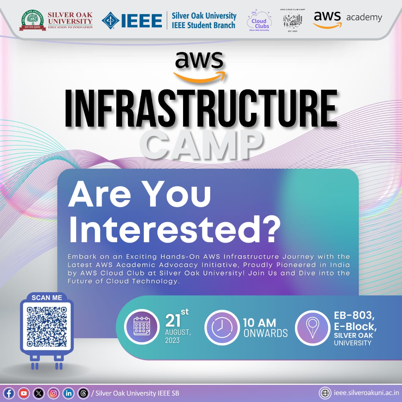 Department of Computer Engineering, SOawCET, AWS Cloud Club at Silver Oak University and Silver Oak University IEEE Student Branch presents the groundbreaking ' Infrastructure Camp ' as part of the revolutionary 'AWS Cloud Camp'! initiative by AWS Academic Advocacy Team and brought first to you in the world.