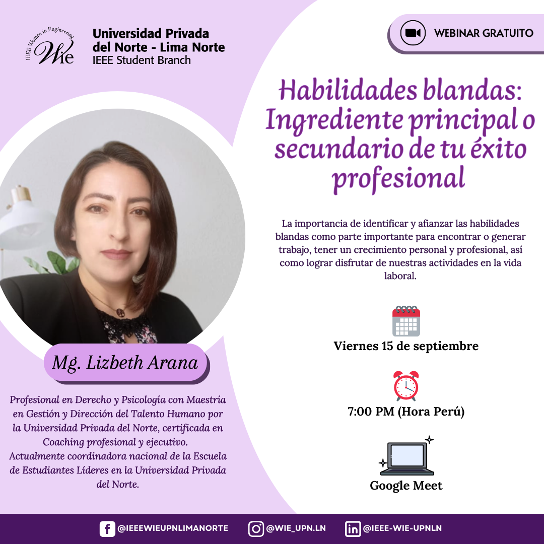 El Grupo de Afinidad Estudiantil IEEE WIE UPN - Lima Norte se complace en invitarlos a nuestro webinar gratuito “Habilidades blandas: Ingrediente principal o secundario de tu éxito profesional” , el cual será dictado por la Mg. Lizbeth Arana , profesional en derecho y psicología. No te pierdas esta gran oportunidad de conocer que tan importante es desarrollar nuestras Soft Skills y el plus que estas nos pueden brindar al postular a algún empleo 🤩.