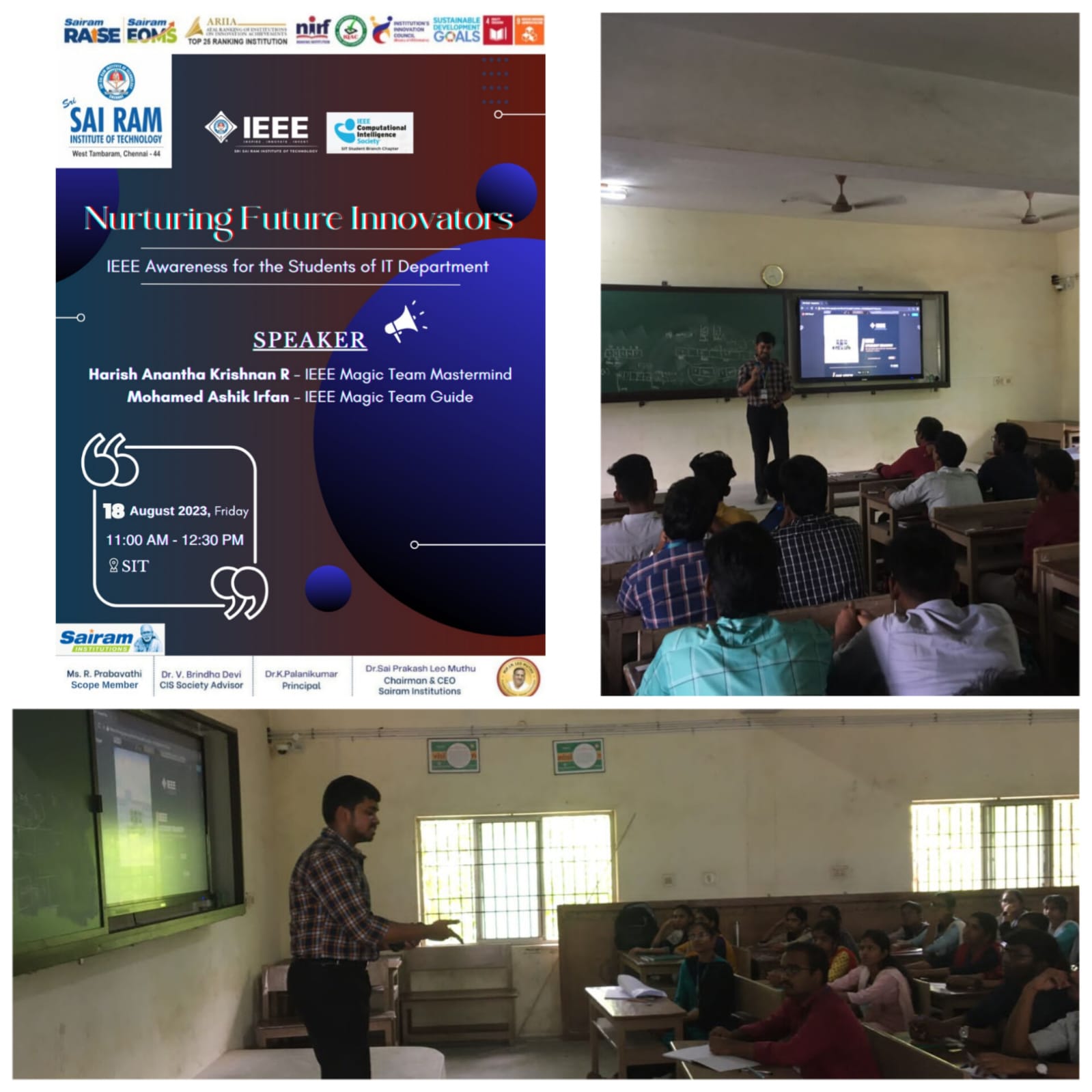 On August 18, 2023, the Sri Sairam Institute of Technology's IT Department hosted a session titled "Nurturing Future Innovators: IEEE Awareness," led by Harish Anantha Krishnan R and Mohamed Ashik Irfan. Harish Anantha Krishnan R, an IEEE SB CIS Society member and creator of the Magic Team, and Mohamed Ashik Irfan, another dedicated IEEE SB CIS Society member, aimed to deepen IT students' understanding of IEEE's global significance, mission, and opportunities. The event began at 11:00 AM, welcoming enthusiastic students and faculty.