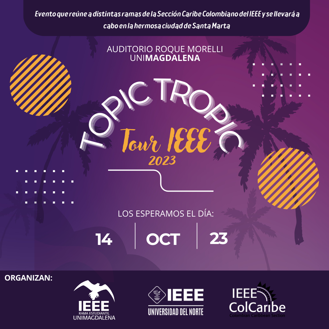Tropic Topic Tour 2023 es un evento único que reúne a distintas ramas de la Sección Caribe Colombiano del IEEE y se llevará a cabo en la hermosa ciudad de Santa Marta, en la Universidad del Magdalena.