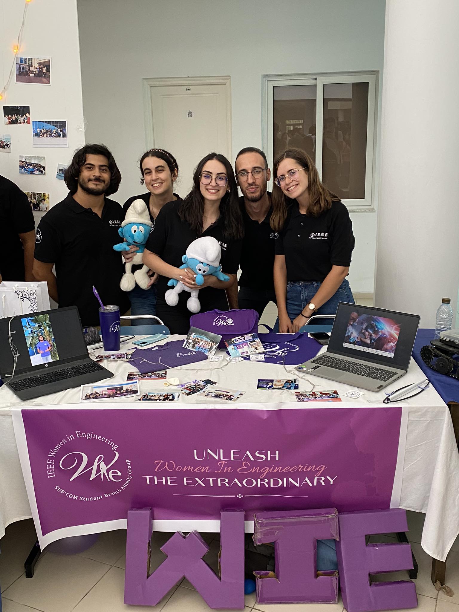 Following the presentation, from 3 pm to 5 pm, the WIE Affinity Group hosted an interactive booth in the bustling hall of the SupCom building. The booth was a vibrant hub of activity, with members of the group eagerly waiting to answer questions and engage in discussions with the freshmen.