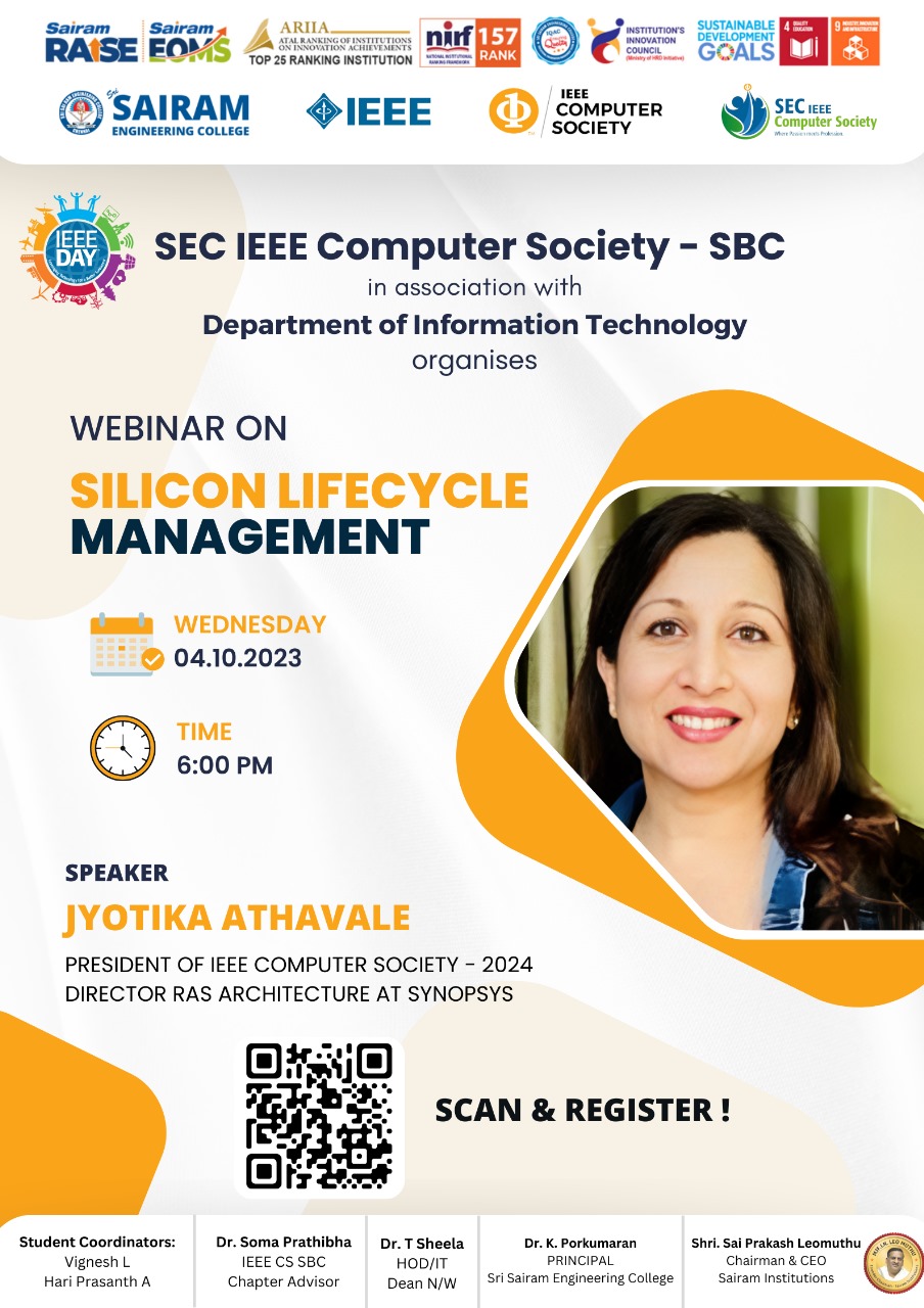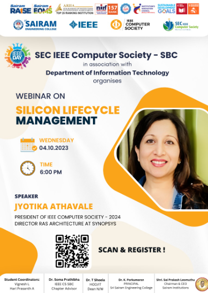 Brief Description: The Department of Information Technology, in collaboration with the IEEE Computer Society Student Branch Chapter of Sri Sairam Engineering College, hosted an ecstatic webinar ‘WEBINAR ON SILICON LIFECYCLE MANAGEMENT’ by Ms. Jyothika Athavale, President of IEEE MGA Computer Society on October 3rd, 2023, emphasized the significance of effectively managing silicon's lifecycle in today's technological landscape. Ms. Athavale's keynote speech underscored the necessity of sustainable practices and responsible manufacturing throughout the lifecycle stages of silicon-based products.