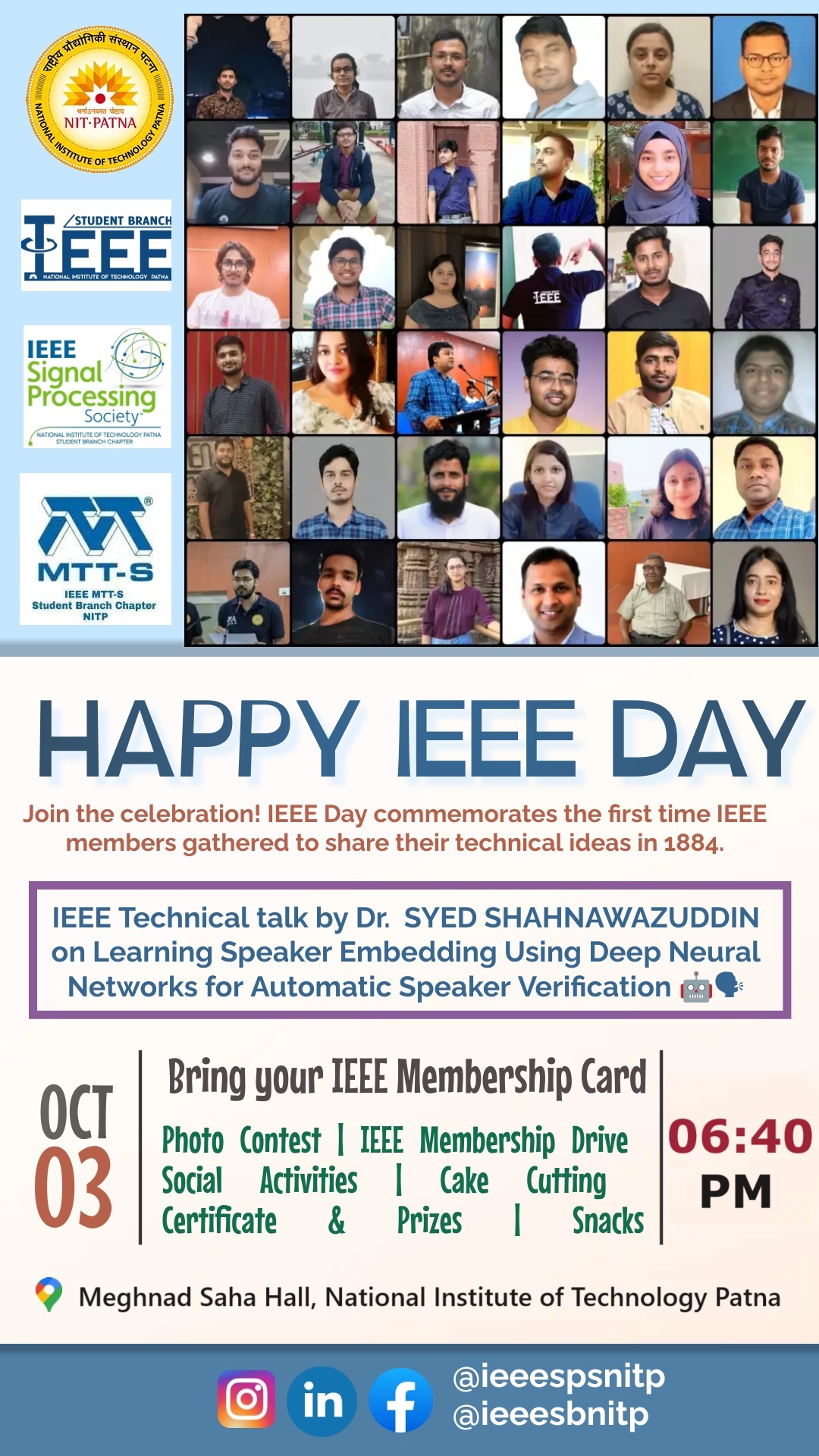 IEEE Day 2023 was celebrated with great enthusiasm by the IEEE Student Branch at NIT Patna, organized by their Society of Signal Processing (SPS) and Microwave Theory and Techniques (MTTS). The event aimed to bring together IEEE members to celebrate technology and innovation. Below is a summary of the exciting activities that took place during the celebration.