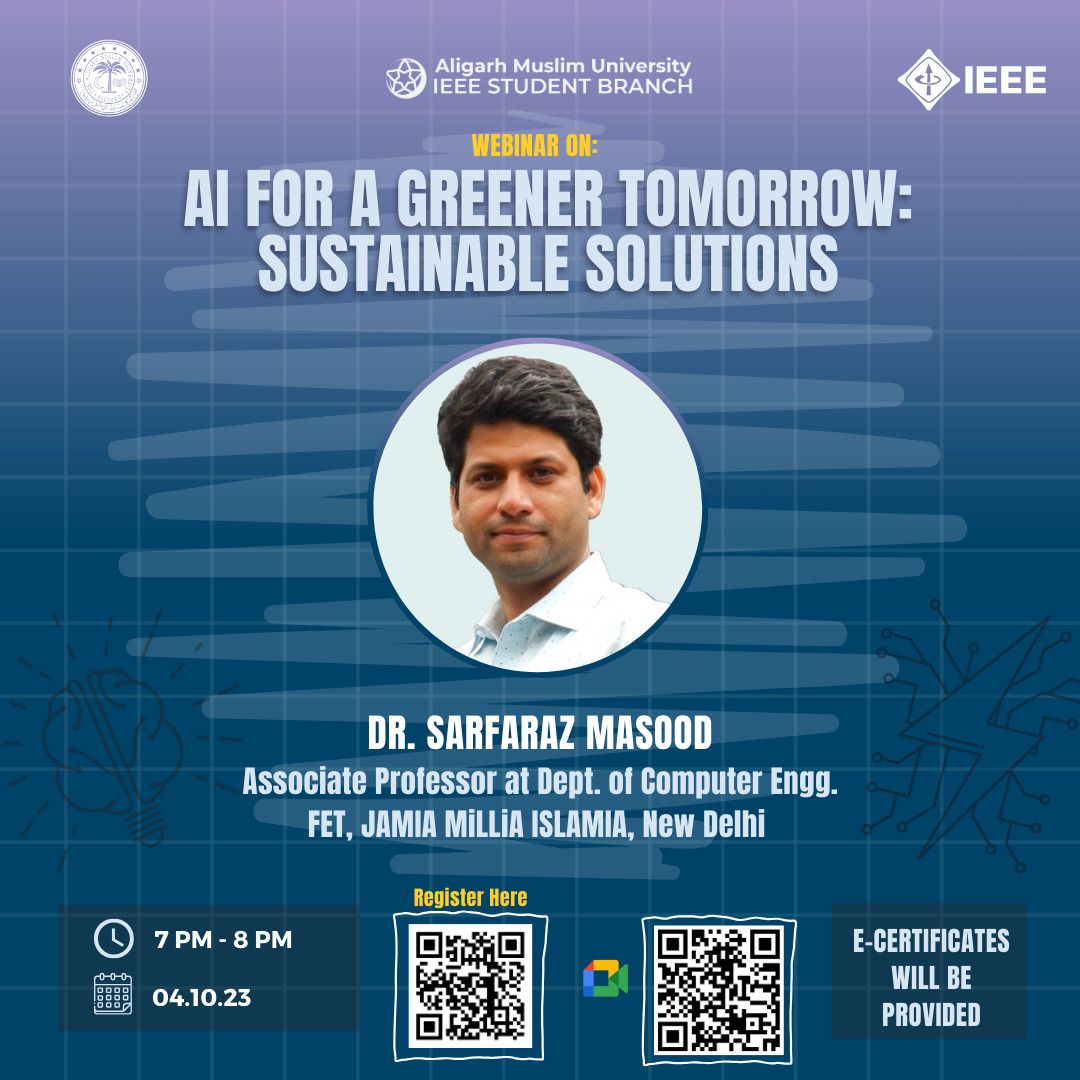 The webinar titled "Artificial Intelligence for a Greener Tomorrow: Sustainable Solutions" was held on October 4, 2023. The speaker for this enlightening event was Dr Sarfaraz Masood, Associate Professor at Jamia Millia Islamia (JMI), New Delhi. Dr Masood shared his expertise in Artificial Intelligence (AI) and its potential to address the 17 Sustainable Development Goals (SDGs). He began the session by highlighting the significance of the 17 SDGs established by the United Nations. These goals cover a broad spectrum of global challenges, including poverty eradication, clean energy, gender equality, environmental conservation and many more. Dr Masood discussed the pivotal role of AI, particularly machine learning (ML), in achieving these SDGs. He actually provided a clear overview of how to use Machine Learning in such a scenario by providing the classifications as Supervised Learning, Unsupervised Learning and Reinforcement Learning. He also
