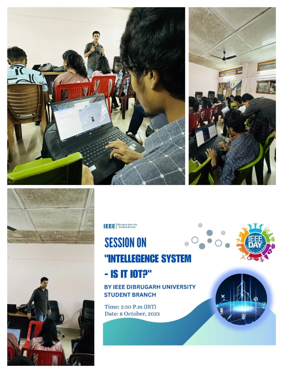 With the new initiative on IEEE Day, our IEEE Dibrugarh Univ Student Branch hosted an event on 8th October'23 titled "Intelligent System - Is it IoT," aimed at providing participants with a foundational knowledge of the Internet of Things (IoT) while engaging them with a practical project. The event's highlights included a hands-on project where participants collaborated to create a virtual "smart building." Guided by one of our members Hirak Jyoti Adhikari, who provided valuable insights and tutoring, students used Wowki and Blynk software platforms to perform their project. This practical experience allowed them to apply IoT concepts and offered a glimpse into the exciting world of smart technology. This virtual smart building showcased the potential of IoT, with features like automated temperature and lighting control, as well as remote monitoring of security systems.