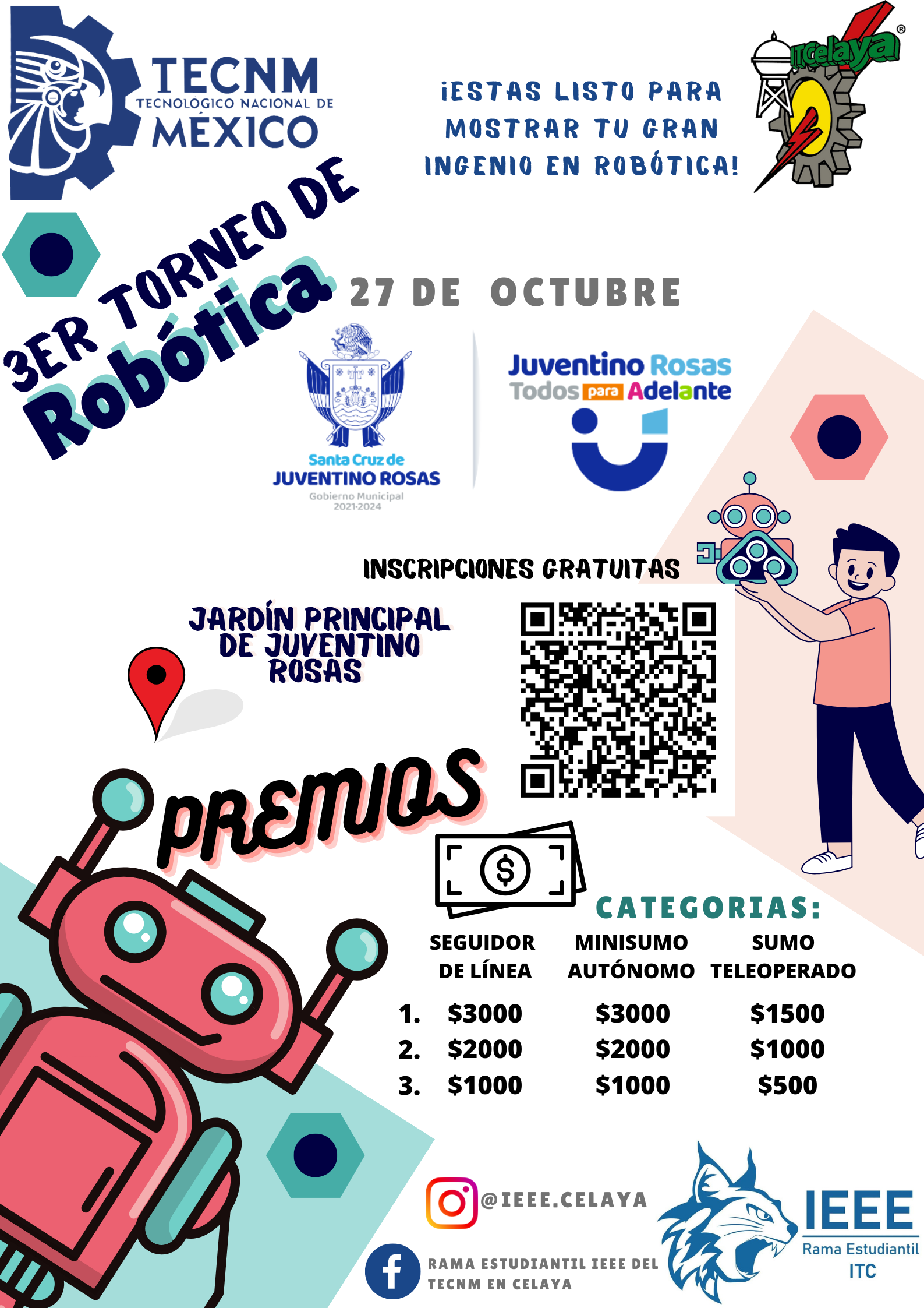 Tercer Torneo de Robótica organizado por la Rama Estudiantil del IEEE con apoyo del Departamento de Ingeniería Electrónica del Tecnológico Nacional de México en Celaya y el Municipio de Juventino Rosas. Categorías de: -SEGUIDOR DE LÍNEA -MINISUMO AUTÓNOMO -SUMO TELEOPERADO