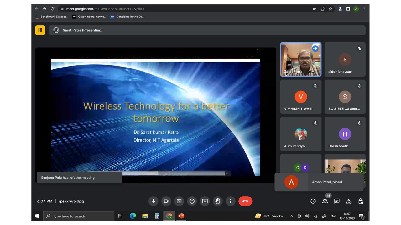 IEEE Computer Society, Gujarat Chapter organised a webinar on the occasion on IEEE Day Celebration. The talk was delivered by Prof. Sarat Kumar Patra, Director NIT Agartala on "Wireless Technology for a better Tomorrow".