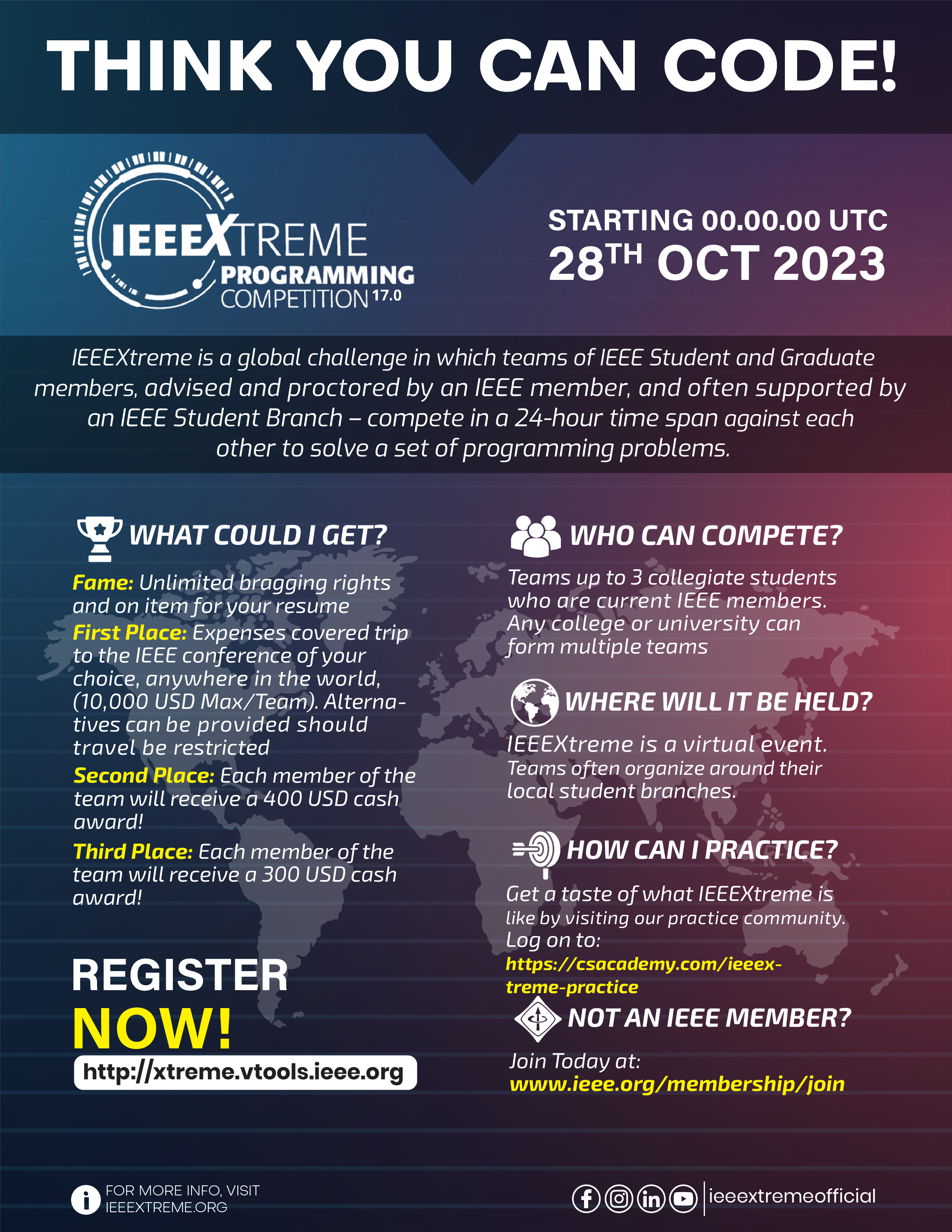 Reports: Student Programming Competition IEEEXtreme 16.0 in Maribor (https://events.vtools.ieee.org/m/329065), Slovenia IEEEXtreme 16.0 (https://events.vtools.ieee.org/m/324177) in Extremno FERImenalno: Slovenia IEEEXtreme 15.0 (https://events.vtools.ieee.org/m/286729).