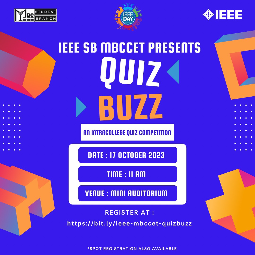 A quiz competition namely 'Quiz Buzz' was conducted as part of the IEEE Day Celebrations of the year 2023 by IEEE Student Branch Of MBCCET. A great response from students in the form of participant count was achieved.A total of 35 teams with four members each participated in the quiz competition.For all the participants a brief introduction to IEEE was given as well .The main focus was on engaging new student members as well as those students who were interested to join IEEE on IEEE Day through such initiative.