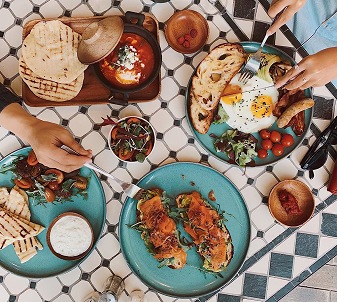 - Varied Appetizers: Falafel + hummus (classic + roasted red pepper). tabbouleh. greek olives + pickled veggies. served with toasted pita.