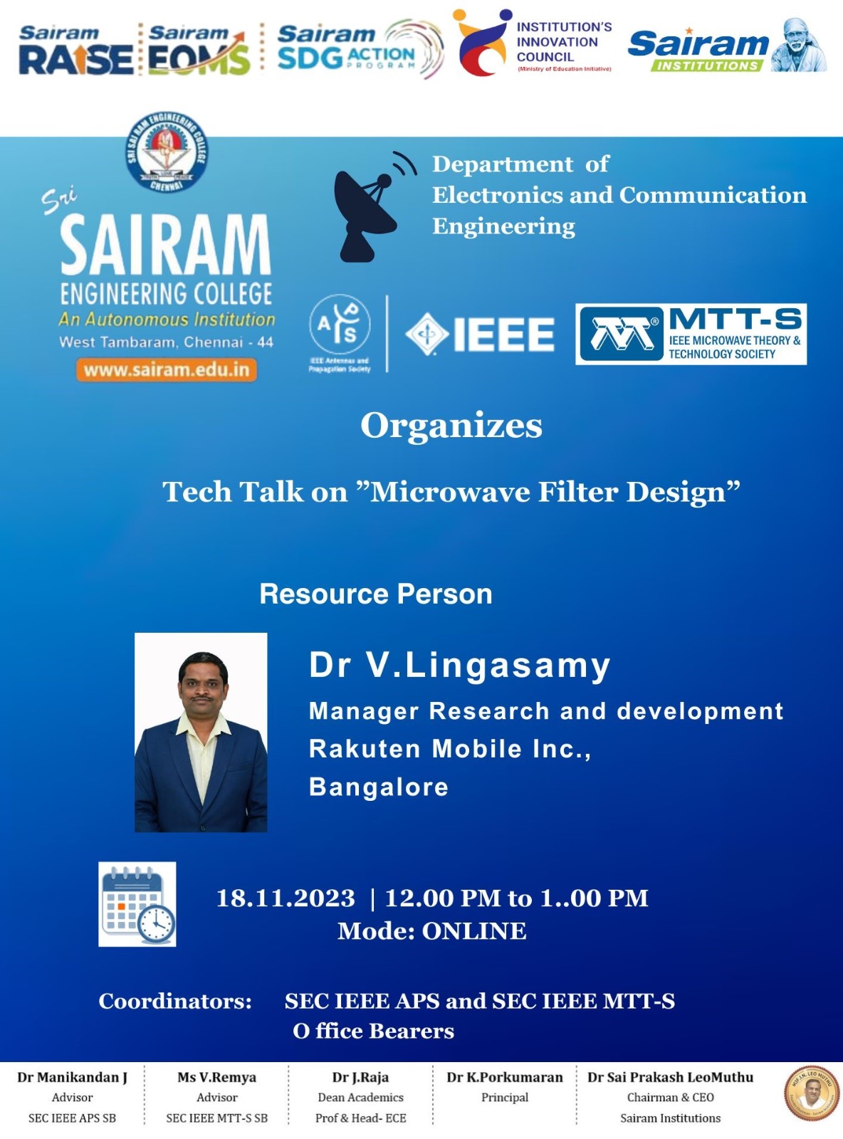 Dr S Brindha, IEEE SB counselor, Sri Sairam Engineering College, gave a welcome address. Then, Dr V Lingasamy, Manager Research and Development, Rakuten Mobile Inc., Bangalore gave a talk on Microwave filter design.