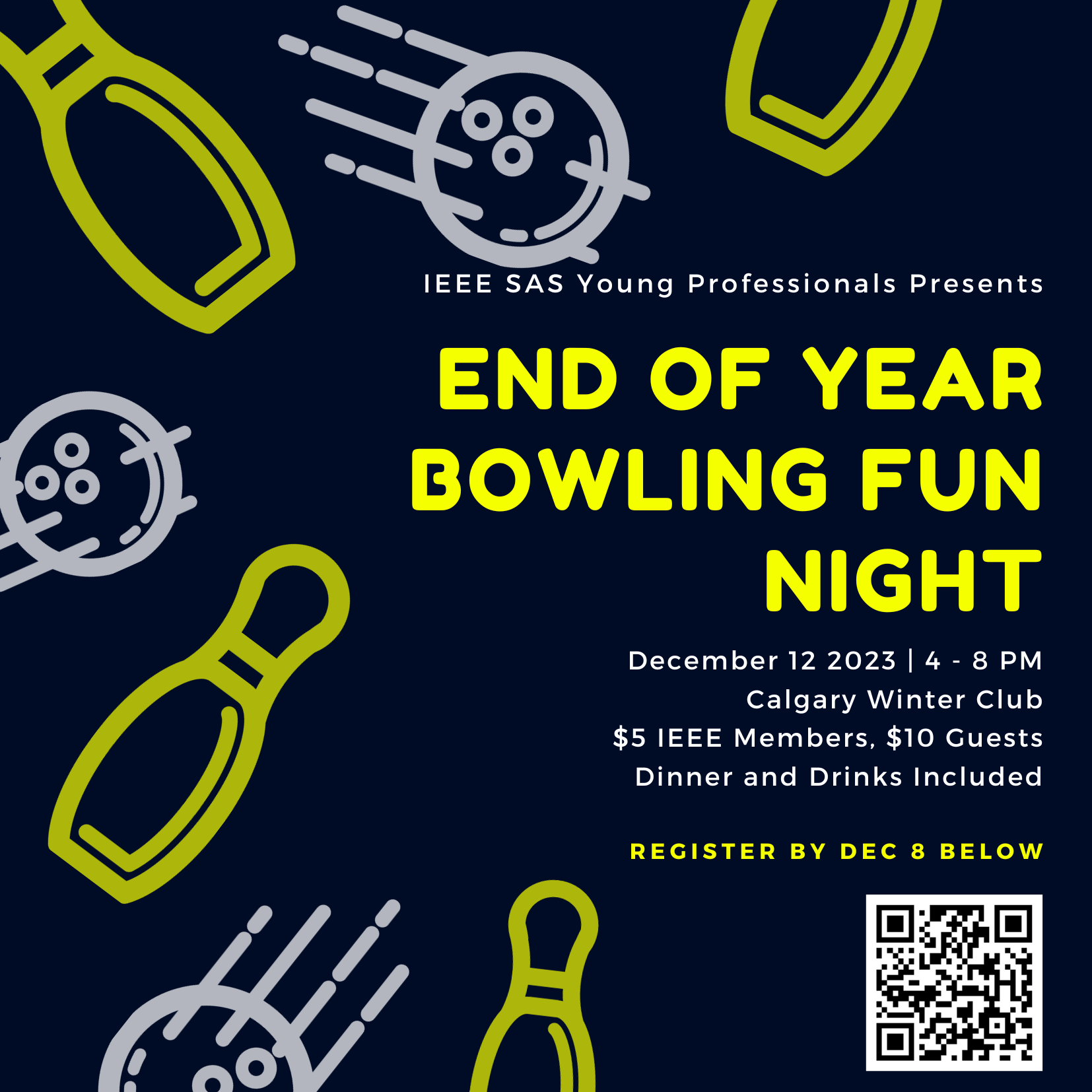 Join the IEEE Southern Alberta Section Young Professionals for our End Of Year Bowling Fun Night, open to all IEEE Members, Non-Members and Guests! You are invited to the Calgary Winter Club for an evening of strikes (both 5-pin and 10-pin), followed by networking at the R&R lounge and yummy bites. In addition to bowling, your ticket includes dinner and drinks. Registration closes on December 8th and we have limited spots, so don't delay! We hope to see you there.