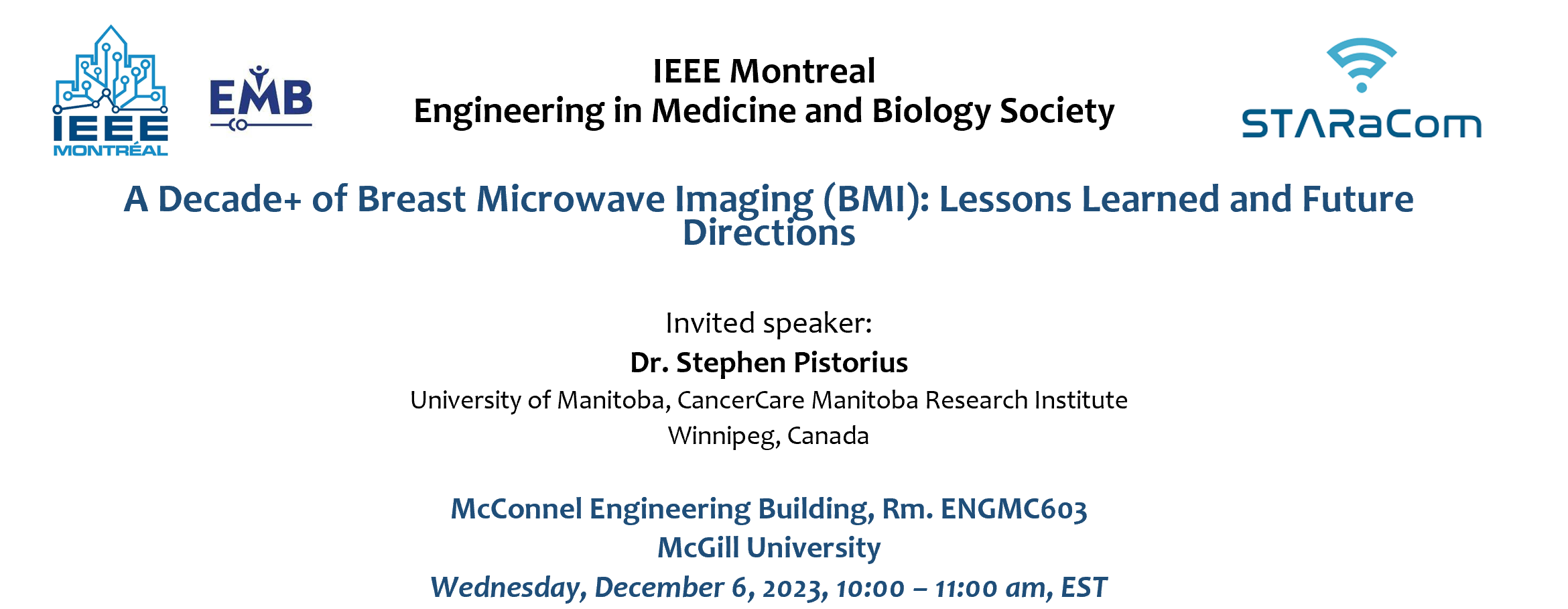 Biography: Dr. Stephen Pistorius, a tenured Professor at the University of Manitoba's Department of Physics and Astronomy, specializes in Medical Physics. He is a Senior Scientist at the CancerCare Manitoba Research Institute and holds cross-appointments in Radiology, Biomedical Engineering, and Human Anatomy & Cell Science. A certified Medical Physicist with diverse leadership experience, he earned degrees in Physics, Radiation Physics, Medical Physics, and a Ph.D. in Physics in South Africa. Additionally, he holds a Post-Graduate Diploma in Business Management from the Edinburgh Business School, UK. Dr. Pistorius is a senior member of the IEEE and a Fellow of the Canadian Organization of Medical Physics (FCOMP). With a background in military, industry, healthcare, administration, and academia, he has held key roles and directed medical physics programs. His research, spanning image processing, reconstruction, medical device development, and diagnostic methods, includes recent work on breast microwave imaging for screening disparities in remote regions and novel PET imaging techniques. Dr. Pistorius has made significant contributions, leading national grants, authoring 300+ publications, and currently supervising twelve trainees, showcasing his commitment to advancing medical physics for improved healthcare outcomes.