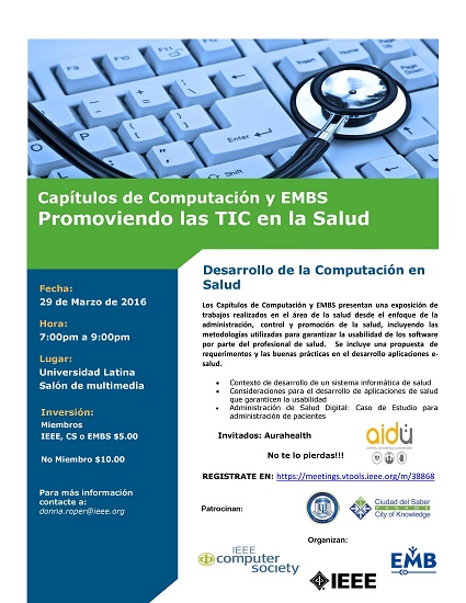 Los Capítulos de Computación y EMBS presentan una exposición de trabajos realizados en el área de la salud desde el enfoque de la administración, control y promoción de la salud hasta las metodologías utilizadas para garantizar la usabilidad de los software por parte del profesional de salud. En esta última se incluye una propuesta de requerimientos y las buenas prácticas en el desarrollo.