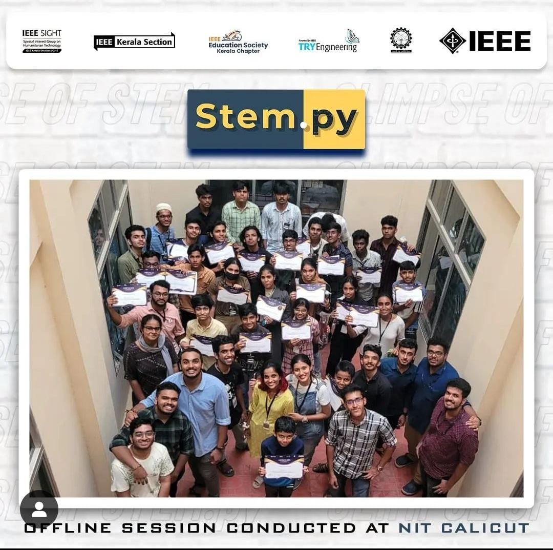 STEM.py, a 16-hour IEEE Try Engineering-funded Python Workshop Series, was organized by the IEEE SIGHT Kerala Section in collaboration with the IEEE Education Society and IEEE SB NIT Calicut. The workshop comprised six online sessions and one full-day offline session. The primary objective of the workshop was to provide participants with a comprehensive understanding of Python programming and its applications in STEM fields.