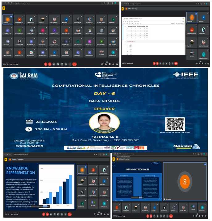 On Friday, December 22nd , 2023, the IEEE Computational Intelligence Society SB at Sri Sairam Institute of Technology hosted an engaging online event titled "Computational Intelligence Chronicles - Day 6 : “DATA MINING". Supraja , an illustrious member of the 3rd year IT department and the esteemed IEEE CIS SB Secretary ,graced the event as the keynote speaker . Her expertise and insights into data mining captivated the audience and shedding light on the potential of this field . The session was a resounding success , drawing an enthusiastic audience eager to expand their knowledge horizons . Attendees can expect discussions and presentations on cutting-edge techniques and methodologies within these domains, aiming to enhance understanding and application in the field of machine learning . In conclusion exploration of 'Data Mining' on its 6th day served as a testament to the inexhaustible reservoir of innovation and knowledge within the field of computational intelligence. The valuable discourse led by Supraja, coupled with the active engagement of participants, reinforced the significance of continuous learning and collaboration in driving technological advancement.