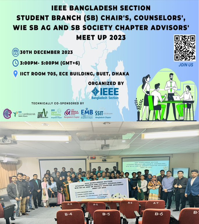 Following the tradition of each consecutive year, this year in 2023- IEEE Bangladesh Section is organized "IEEE Bangladesh Section Student Branch (SB) Chair's, Counselors', WIE SB AG and SB Society Chapter Advisors' Meet up 2023" in hybrid mode. The virtual mode is organized on the Zoom platform and the physical at IICT Room 705, ECE Building, BUET, West Palashi, Dhaka, Bangladesh on 30th December 2023. Student Branch Chairs, student Branch WIE AG Chairs, student Branch Society Chapter Advisors' and Student Branch Counselors are attend the Summit. Student Branches, Affinity Groups, and Society Chapters are the heart of the section and significant stakeholders for the overall activities, it was necessary to meet up all the leaders of the section to come up in a common platform to share ideas and discuss on successful initiatives that can put a remarkable milestone in the Section's Portfolio.