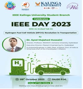 IEEE Kalinga University Student Branch in association with IEEE Women in Engineering AG Madhya Pradesh section organized an invited talk entitled " Hydrogen Fuel Cell Vehicle (HFCV): Revolution in Transportation" on 09th October 2023 in online mode (Google meet) on the eve of IEEE day 2023. The webinar was hosted by Mr. Anup Kumar Jana, IEEE Kalinga University Student Branch Counsellor, Kalinga University. First of all, the event host gave a warm welcome and briefed the profile of the resource person Dr. S M Hussaini, Director, NSAKCET & Plastech Engineering, Hyderabad. Dr. Hussaini started his talk with two category of vehicles globally used like ICE Vehicles (using Petrol as fuel) and E-Vehicles (using batteries as fuel supplier). The webinar projected the pros and cons of both category of vehicles.