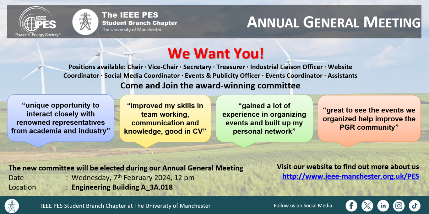 We would like to invite you to the Annual General Meeting of the IEEE PES Student Branch Chapter at The University of Manchester. We will reflect on 2023 and discuss the highlights and accomplishments. Moreover, we will elect the new committee members for 2024.
