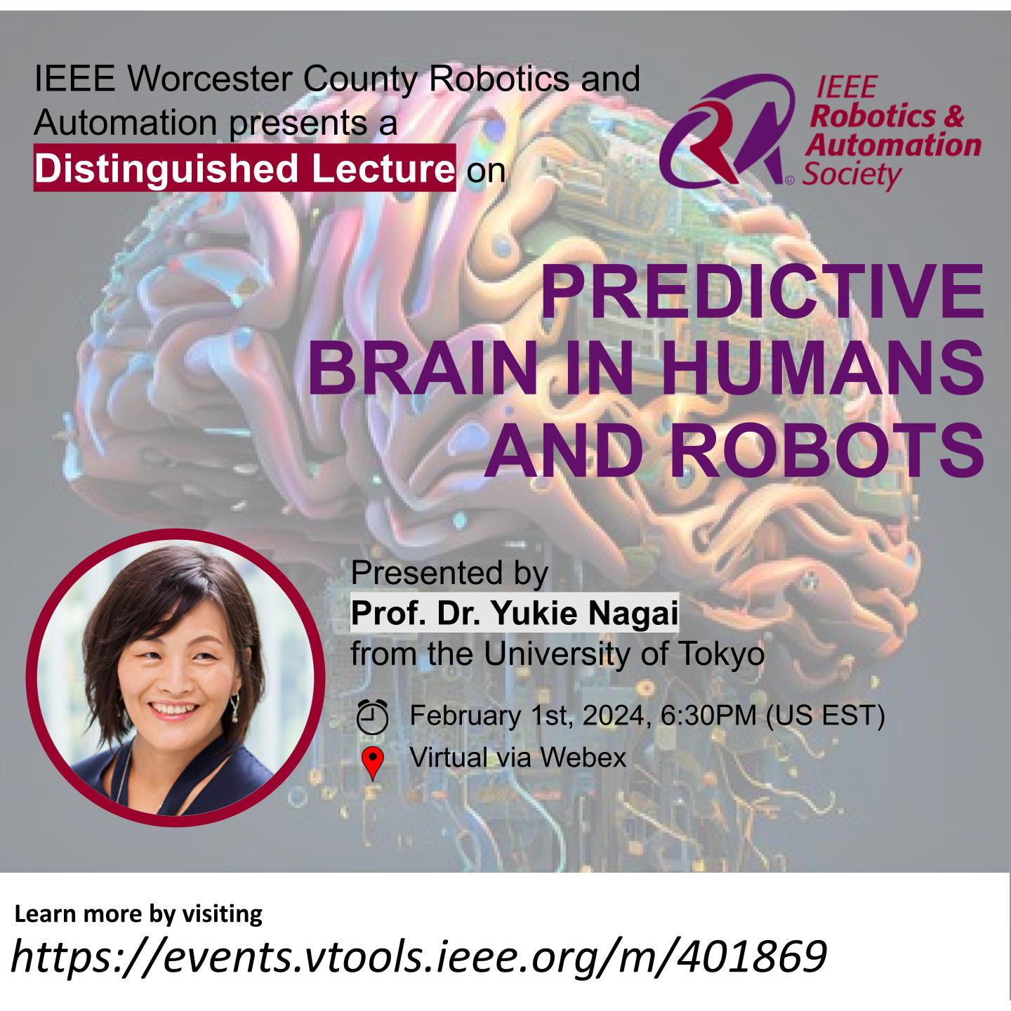Hosted by IEEE Worcester County Section and the IEEE Worcester County RA Chapter, join us for a technical presentation from Distinguished Lecturer Dr. Nagai from the University of Tokyo on "Predictive Brain in Humans and Robots". This will be a virtual Webex meeting on February 1st, 2024 at 6:30PM US EST time. This event is FREE to attend.