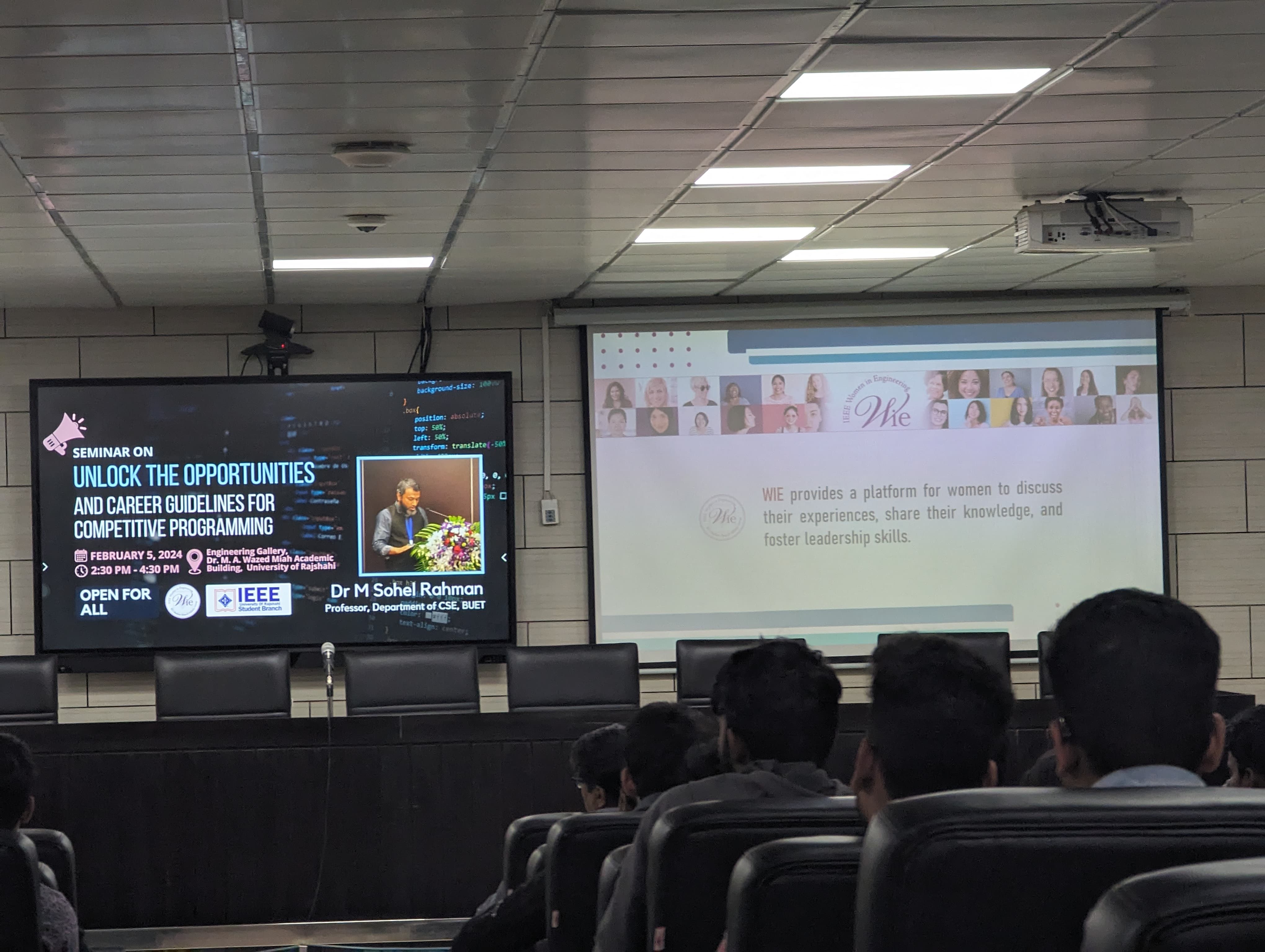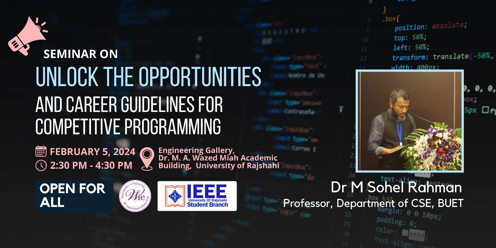We, IEEE Women In Engineering Affinity Group RUSB are thrilled to announce you a seminar on "Unlock the opportunities and career guidelines of competitive programming". This seminar has a goal to promote enthusiasm about competitive programming amongst the students specially freshers.