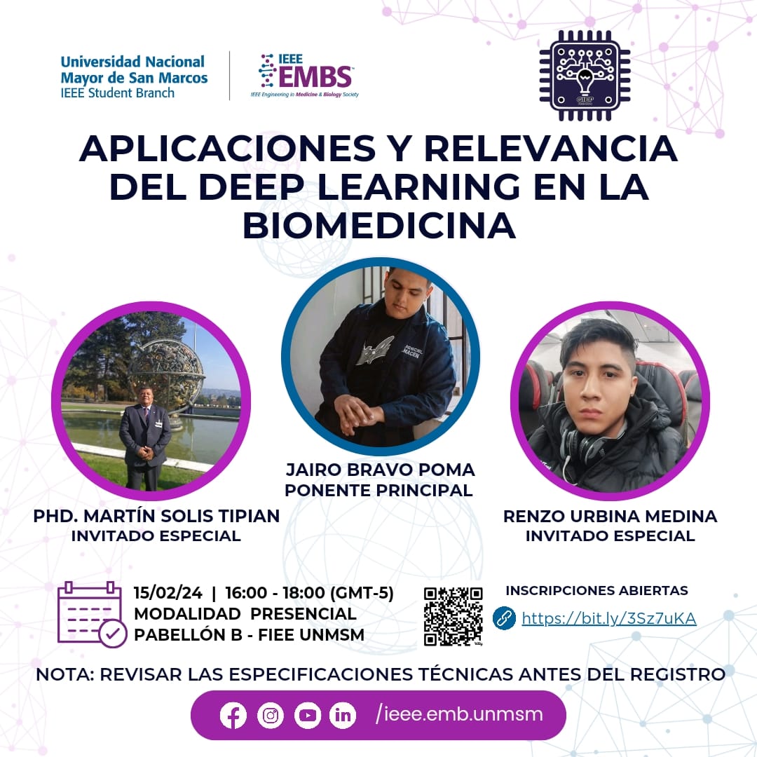 Únete a nosotros en este taller organizado por el capítulo EMBS UNMSM, donde exploraremos el fascinante mundo del Deep Learning y su impacto en el ámbito de la Biomedicina. Este evento proporcionará una visión integral de las aplicaciones actuales, desde el diagnóstico médico hasta la investigación biomédica y el descubrimiento de fármacos.
