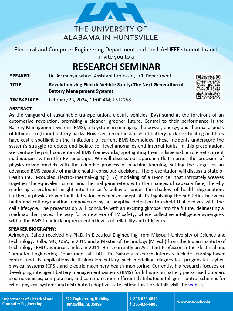 Dr. Avimanyu Sahoo, Assistant Professor, ECE Department will be presenting a research seminar of "Revolutionizing Electric Vehicle Safety: The Next Generation of Battery Management Systems." For more information, see attached flyer