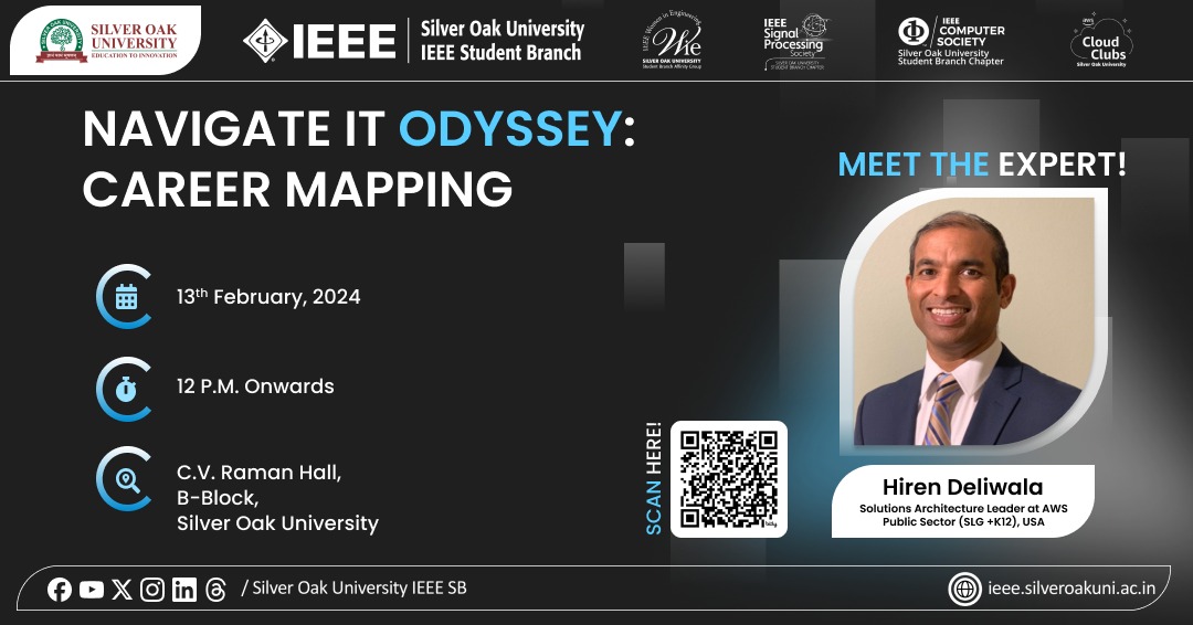 Embark on an exhilarating adventure at "Navigate IT Odyssey: Career Mapping” to explore the dynamic world of IT Cloud Services with Silver Oak University IEEE Student Branch and AWS Cloud Clubs, Silver Oak University!