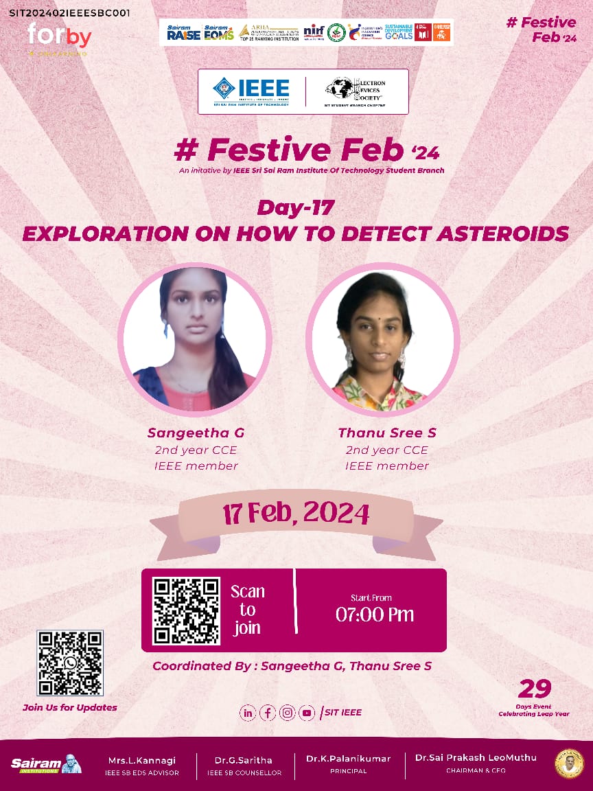 The event hosted by IEEE SRI SAIRAM INSTITUTE OF TECHNOLOGY Student Branch and IEEE SBC Electron Devices Society[EDS] on February 17th was an enlightening exploration into asteroid detection. Led by speakers Sangeetha G and Thanu Sree S,attendees delved into the methods and techniques utilized to detect and track asteroids as they traverse space. A demontration was done to detect the asteroids moving in the outer space. By joining the session, attendees embarked on a journey to explore the fascinating intersection of science and exploration.