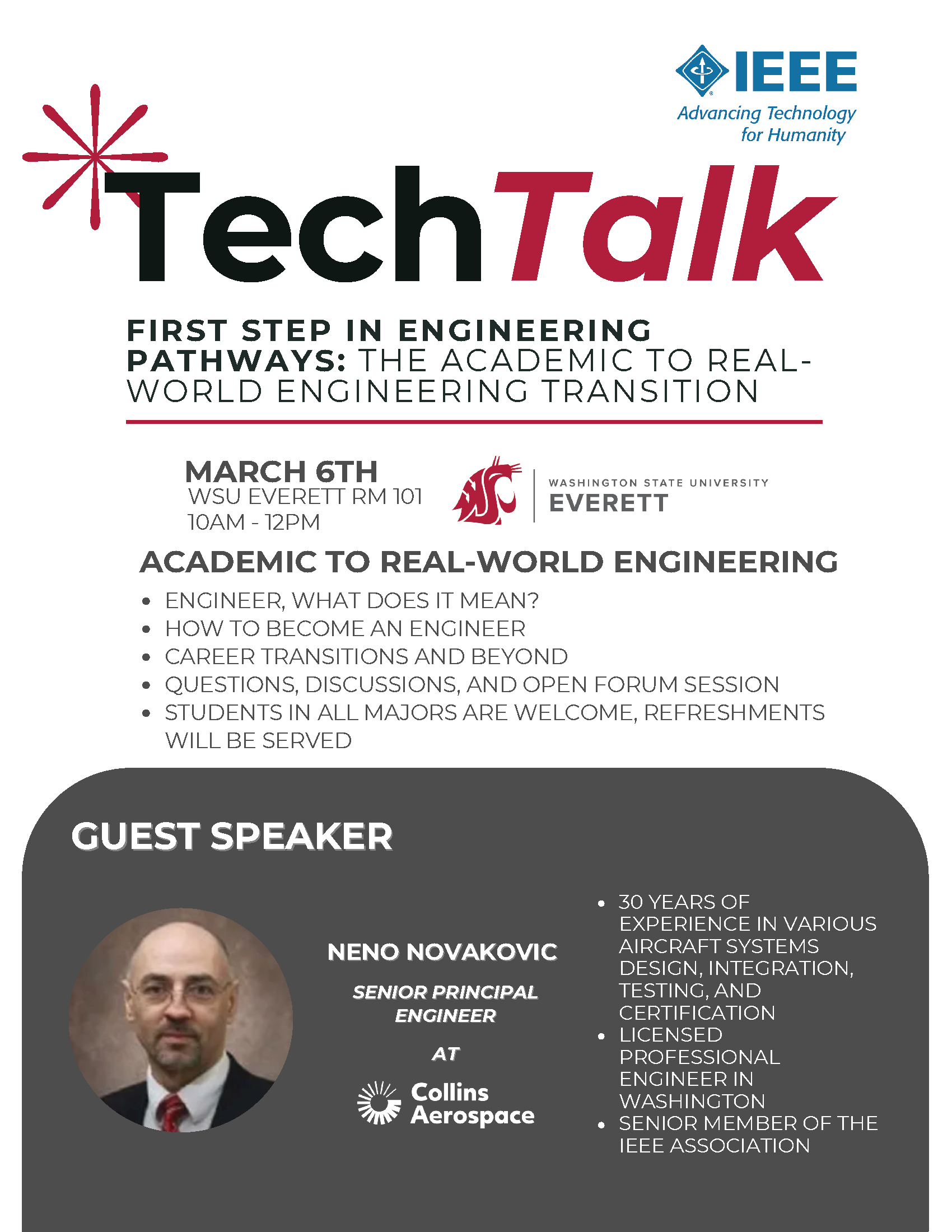 Our esteemed speaker, Mr. Neno Novakovic, P.E., has over 30 years of experience in the aircraft engineering industry and will guide attendees through an exploration of the multifaceted role of engineers and what it truly means to pursue a career in this dynamic field. Drawing from his extensive professional background, our speaker will share personal anecdotes, valuable lessons learned, and practical strategies for success in the engineering realm.
