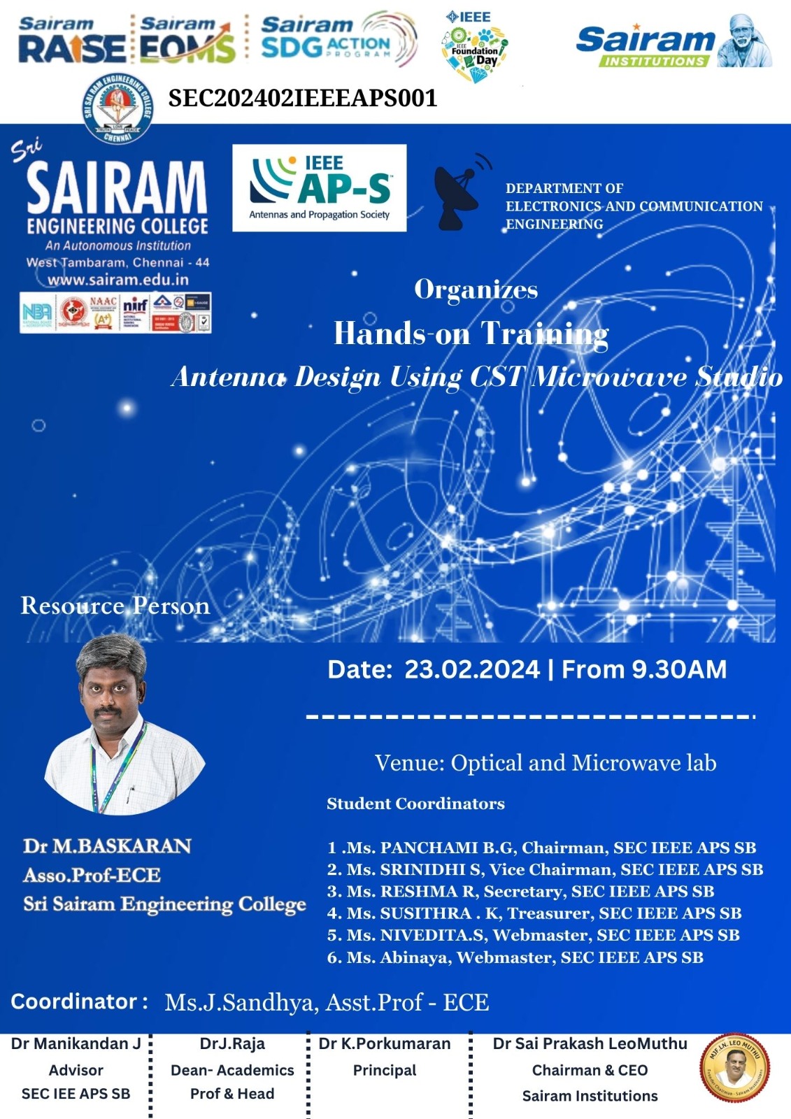 On 23rd February 2024, the Department of Electronics and Communication Engineering associated with the IEEE Antennas and Propagation Society SEC student branch chapter conducted a hands on training on Antenna design using CST Microwave Studio. The session started at 9.30 am. The host, Srinithi S, Vice Chairperson IEEE APS SEC SB started with Welcome Address.