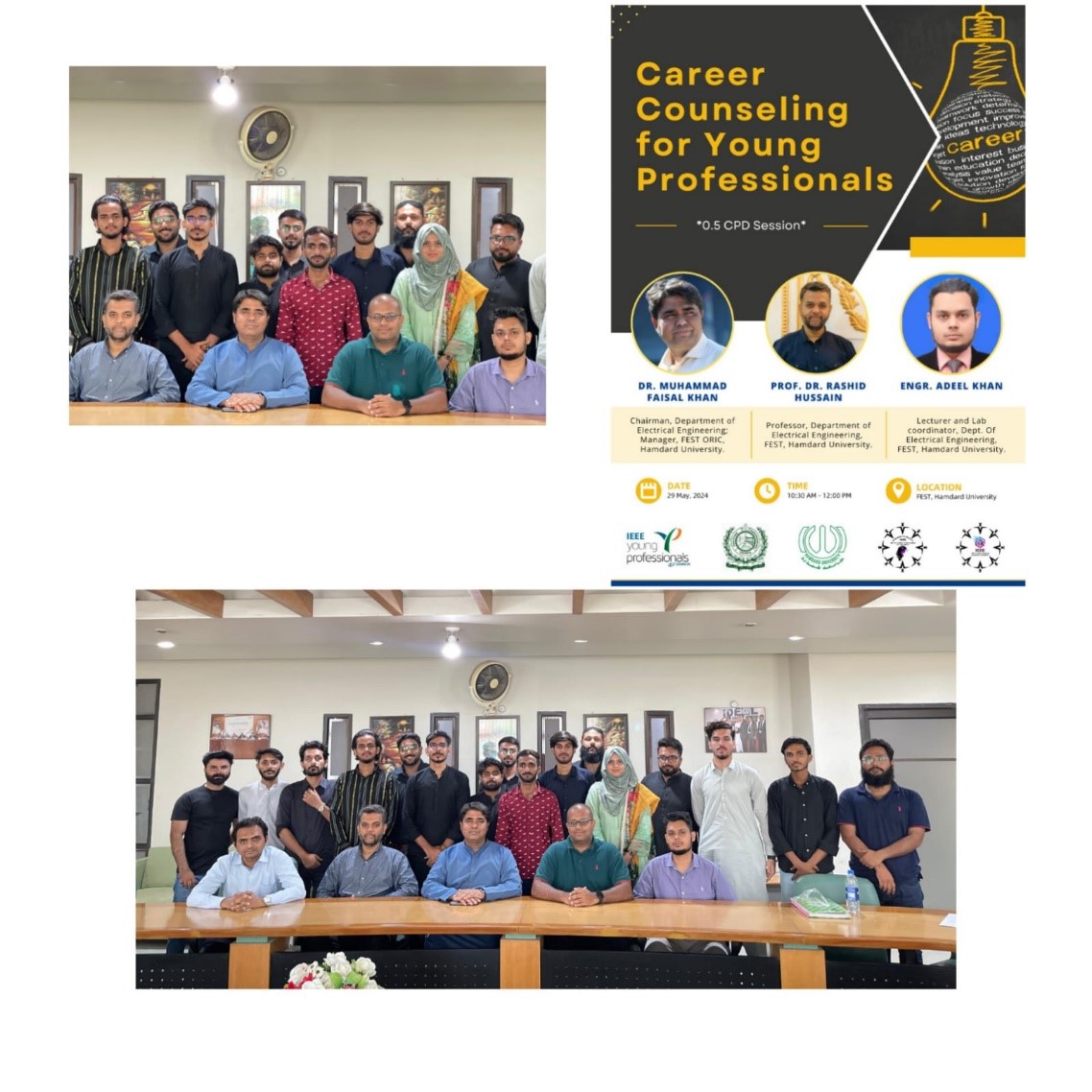 After that the first respected speaker Dr. Rashid Hussain (Professor of Electrical Department, Hamdard University) gave valuable information about the latest trends in industries or companies which must be done by the students. He also shares his experience and different opportunities with the students. Dr. Muhammad Faisal Khan (Chairman of Dept Electrical Engineering, Hamdard University) gave valuable information and knowledge about job hunting strategies in which he also guide the students how to make resume, how to make themselves valuable according to latest trends in industries. The importance of building professional networks and leveraging platforms like LinkedIn. Techniques for facing job interviews, including common questions and appropriate responses. Guidance on using various job portals and company websites to find job openings. After that he also gave some valuable tips for securing an internship such as methods for finding relevant internship opportunities. Steps to apply for internships and what recruiters look for in candidates. How to make the most of an internship, including learning opportunities and networking within the organization. He also guided students for Post graduation from different national or international universities he also shares top best scholarship opportunities with the students which is very useful for them. An interactive Q&A session was held, allowing students to ask questions and seek personalized advice from the speakers. The session was highly engaging, with many students participating and gaining valuable insights into their career paths. The event concluded with a vote of thanks by [Insert Name], who expressed gratitude to the speakers for their invaluable contributions and to the attendees for their active participation. The event successfully provided students with the knowledge and tools needed to make informed decisions about their careers post-graduation.