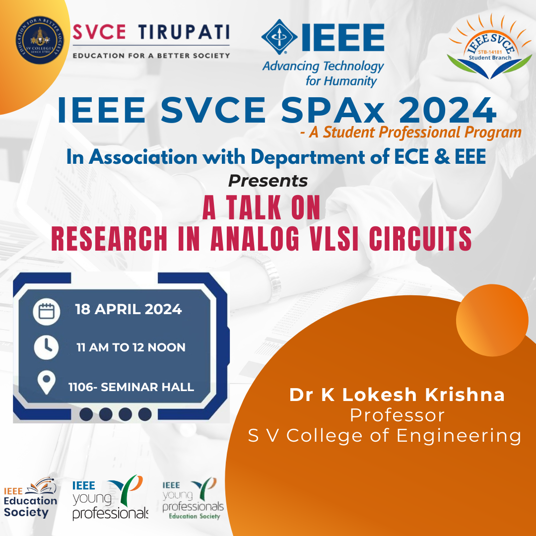 The Session begin with the Invitation of Dr.K.Lokesh krishna sir Resource person of IEEE SPAx 2024. Sir taken a Session on “Research in Analog VLSI Circuits”. The session started with Lokesh Krishna sir delivering a captivating talk on analog VLSI circuits, setting a thought-provoking tone for the gathering. Participants engaged with the complexities and nuances of VLSI design, gaining valuable insights into the field's advancements. Following the enlightening discourse, attendees took a well-deserved snack break, fostering networking opportunities and energizing themselves for the subsequent sessions.