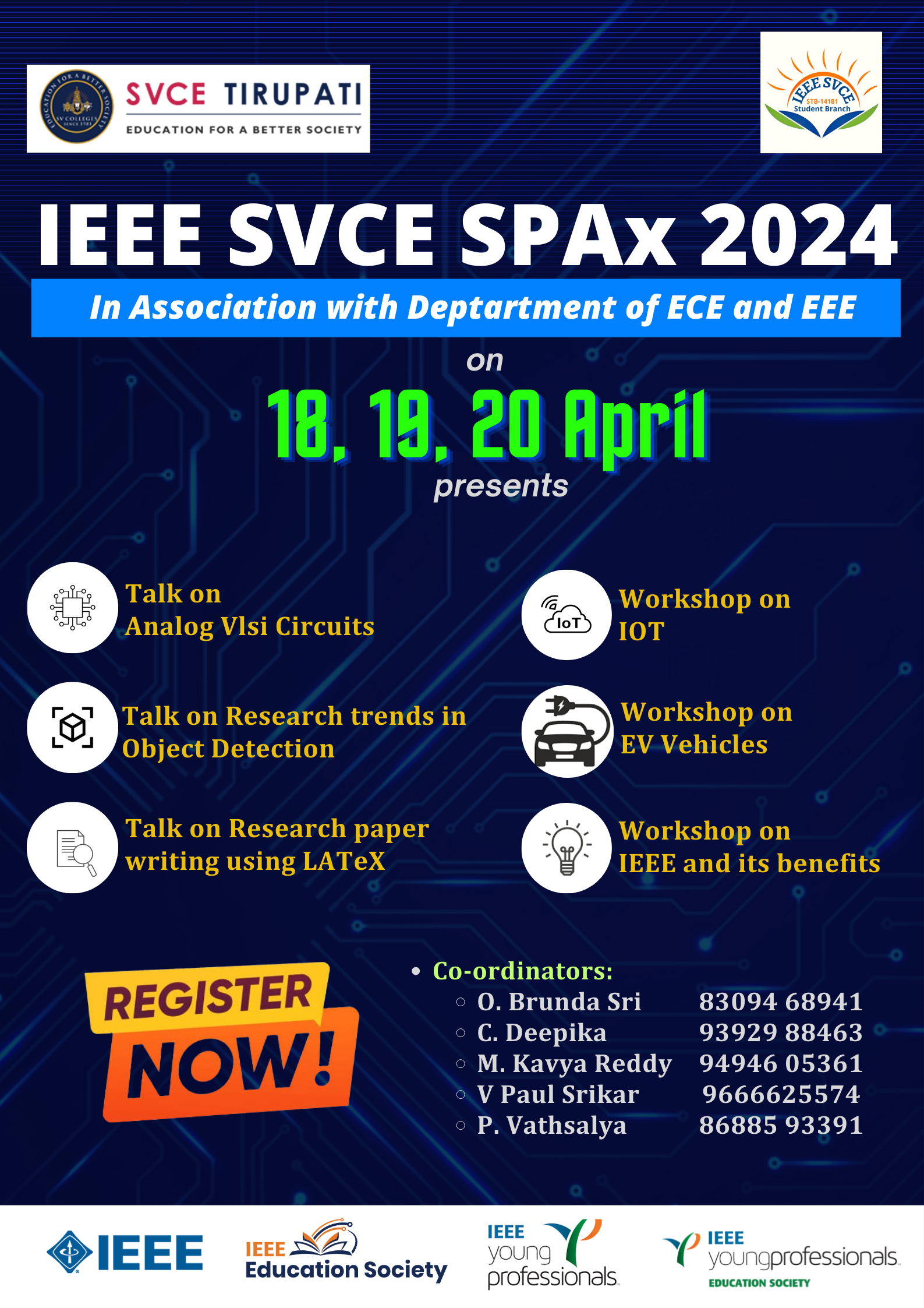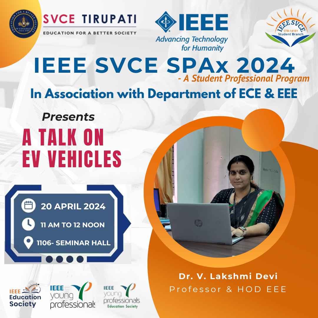 The third day of IEEE SVCE SPAx 2024 commenced with a session on Electric Vehicle (EV) technology, led by Dr. V. Lakshmi Devi Ma'am, providing attendees with valuable insights into the future of transportation. Following this enlightening session.As the day progressed, the event transitioned into its closing ceremony, where dignitaries were invited to express their gratitude by presenting tokens of appreciation to the esteemed resource persons who contributed significantly to the success of IEEE SVCE SPAx 2024. Subsequently, certificates were distributed to students who had registered for the event, acknowledging their participation and dedication.The culmination of the ceremony featured the presentation of certificates to the resource persons,