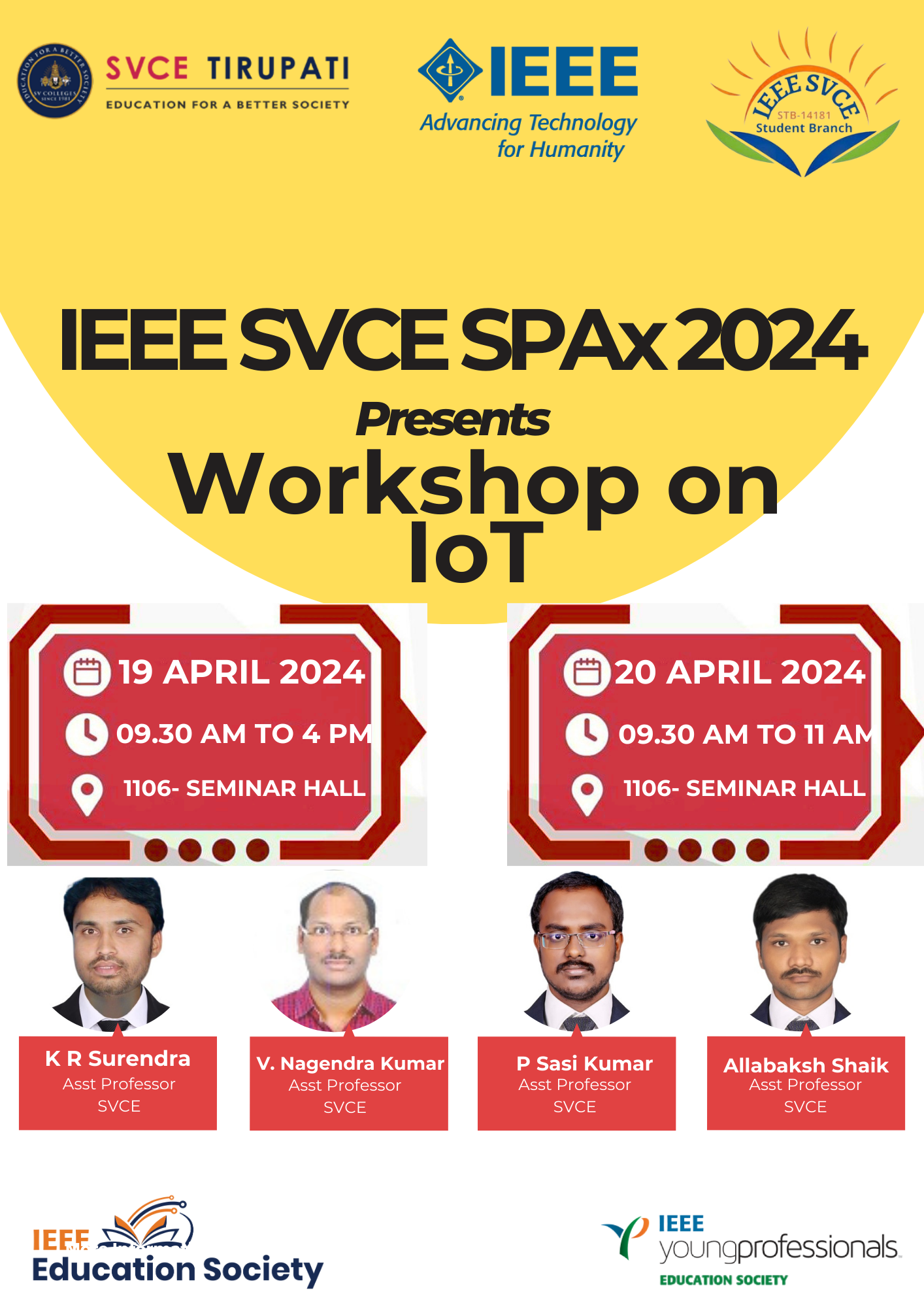 The second day of the IEEE SVCE SPAx 2024 – A Student Professional program session was dedicated to an enriching IoT Workshop led by a team of esteemed faculty including V Nagendra Kumar Sir, P Sasi Kumar Sir, K.V.L Keerthi Mam ,K R Surendra Sir, and Allabaksh Shaik Sir. The faculty actively engaged students, encouraging their participation in various IoT experiments throughout the workshop.