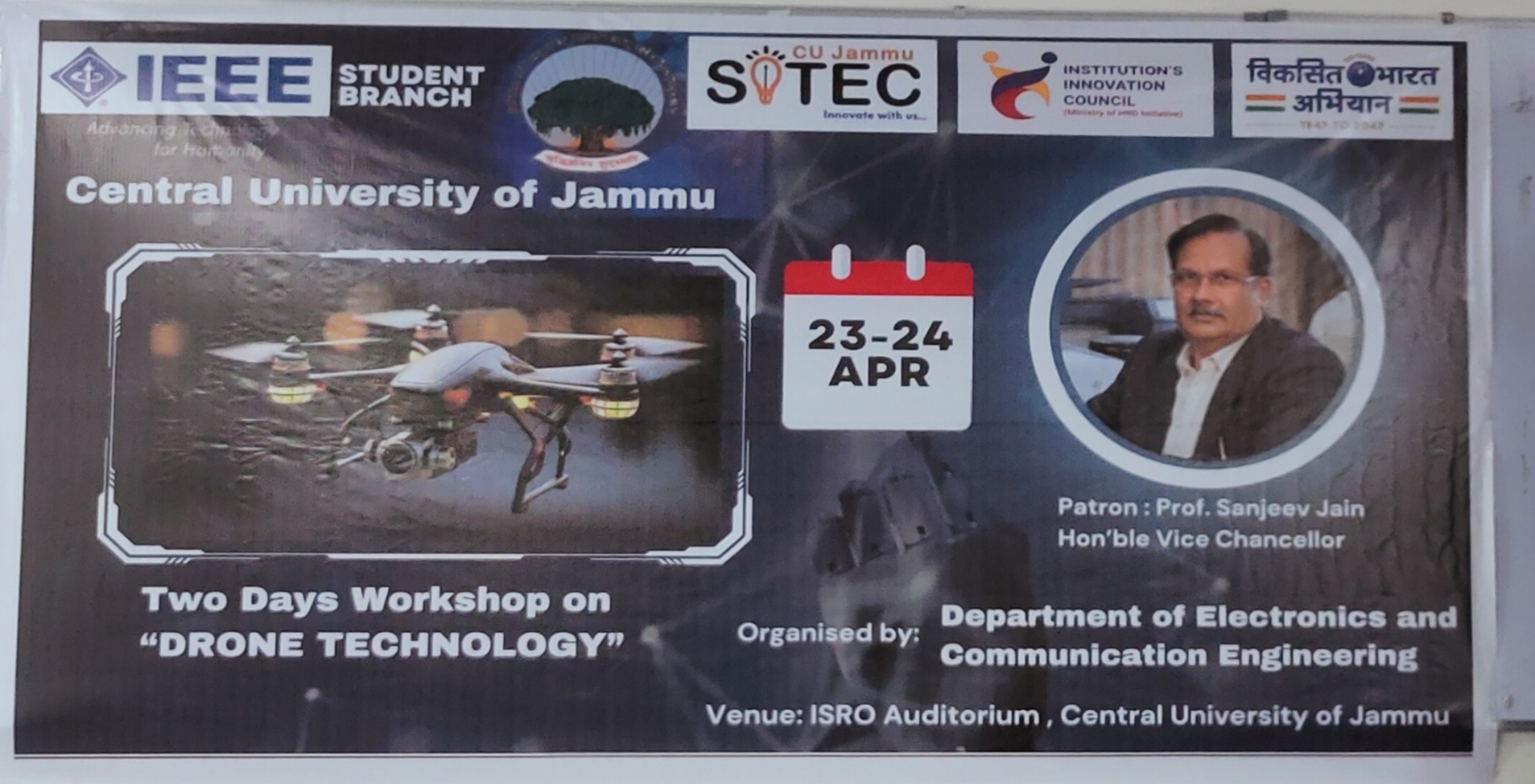The IEEE workshop on Drone Technology and Hardware Engineering was a two-day event held at Central University of Jammu on 23 Apr 2024-24 Apr 2024. The workshop aimed to provide participants with a comprehensive understanding of drone technology, including its hardware components, flight mechanics, control systems, software programming, safety protocols, and legal regulations. This report provides an overview of the agenda, sessions, key takeaways, and interactive discussions that took place during the workshop.