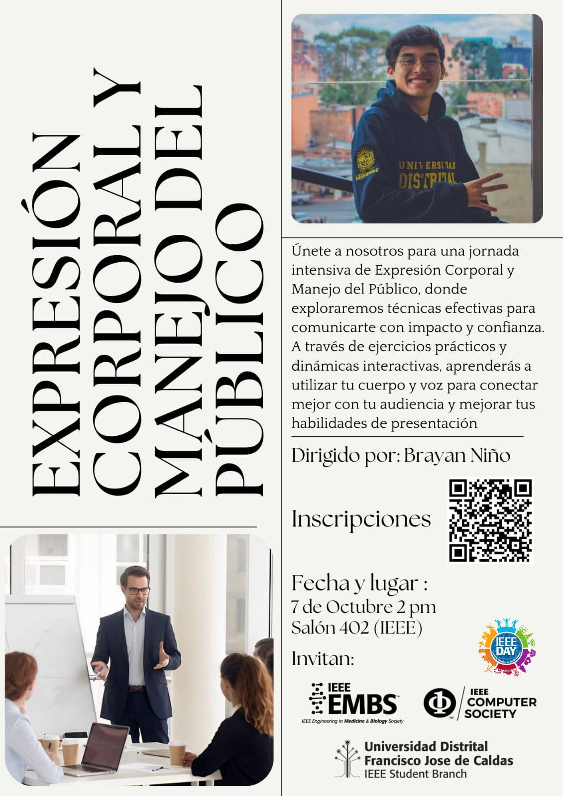 The IEEE Computer Society and Engineering in Medicine & Biology chapters invite you to the ""Body Expression and Audience Management"" workshop. This event is designed to provide practical tools to improve your communication and public speaking skills. Participants will learn essential techniques for body language, confidence building, and effective audience engagement.