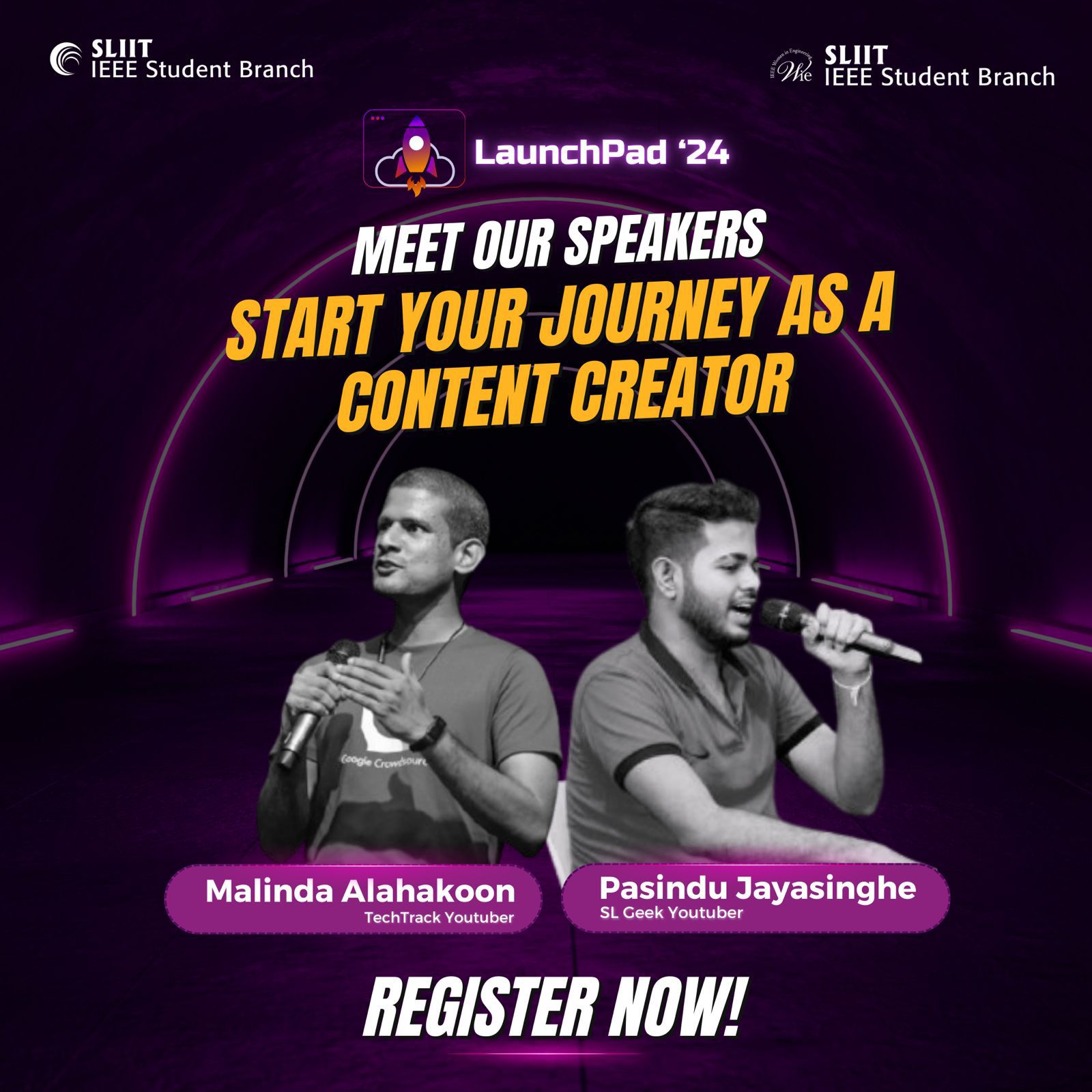 The IEEE WIE Student Branch Affinity Group, SLIIT, organized an engaging webinar series titled Launchpad: A Webinar series on Content Creation. The event featured two renowned YouTubers: Mr. Malinda Alahakoon, the owner of TechTrack, and Mr. Pasindu Jayasinghe, the founder of SL Geek.