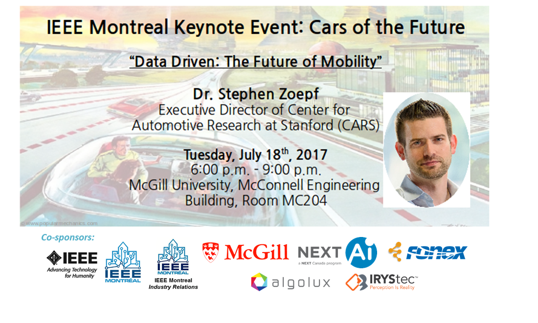 IEEE Montreal Section invites you to attend an invited keynote presentation about the future of self-driving cars. This special event is being organized by the IEEE Montreal Section to bring together IEEE Members, Academics, Industry, Public Sector, Students and Guests to network and enjoy an inspiring technical presentation and discussion. Refreshments will be served before the talk.